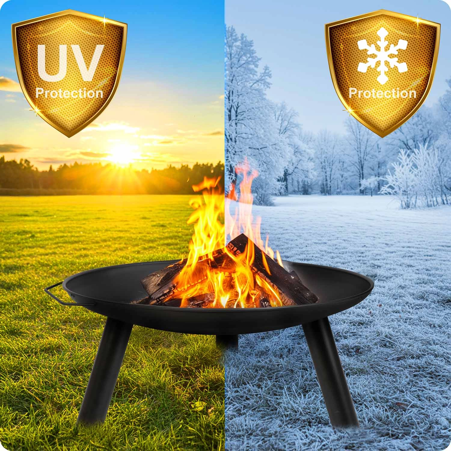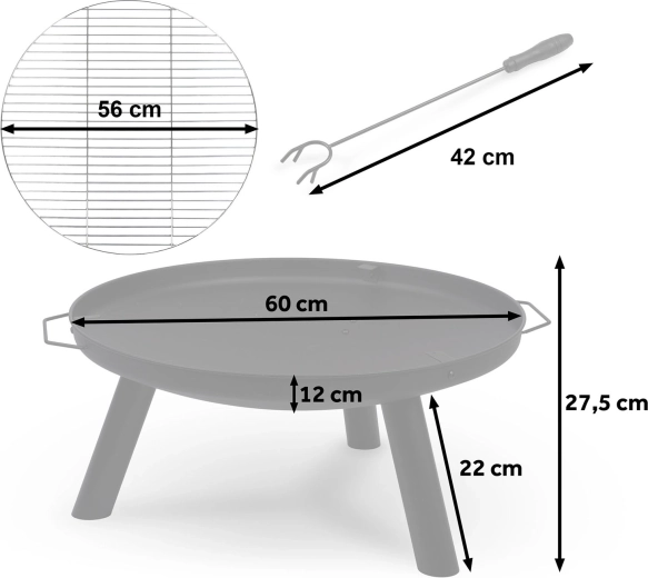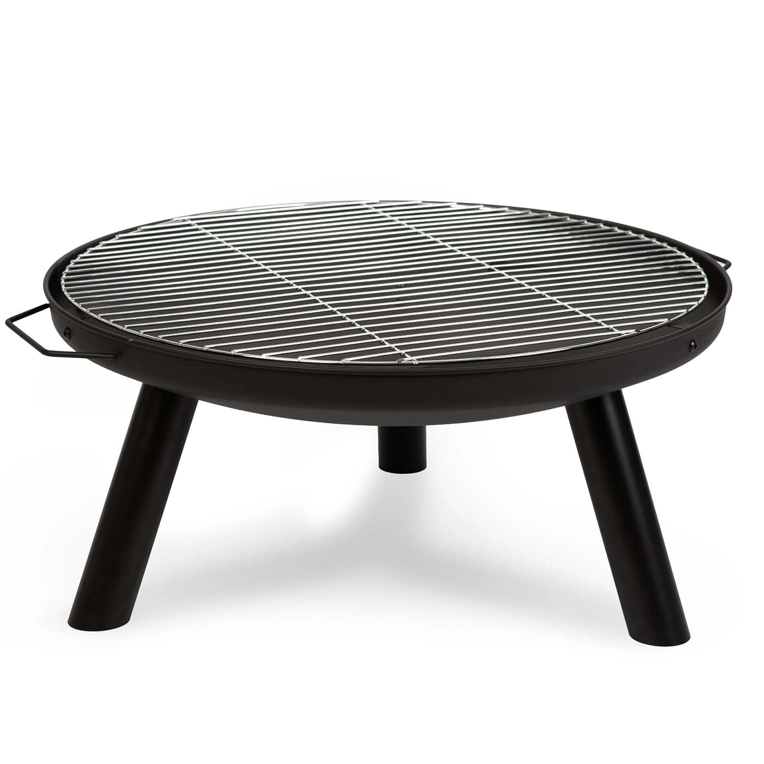 Tri robustné nohy a plytká, široká oceľová misa zabezpečujú stabilitu a efektívne sálanie tepla. Bočné madlá uľahčujú prenášanie po záhrade.