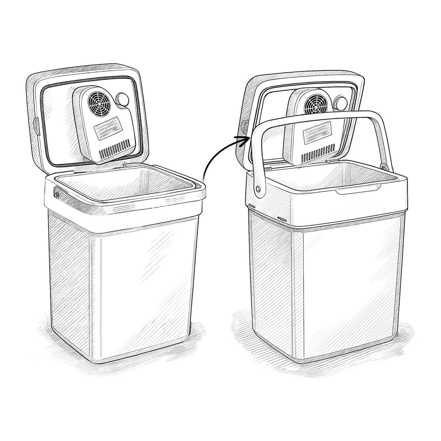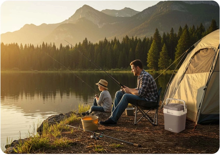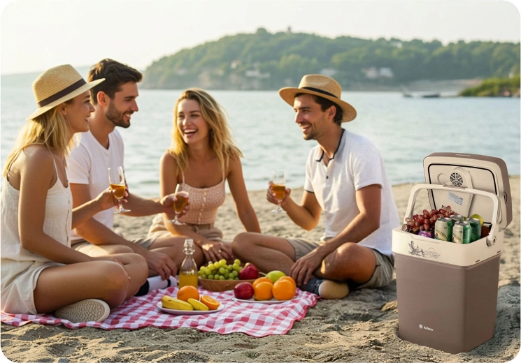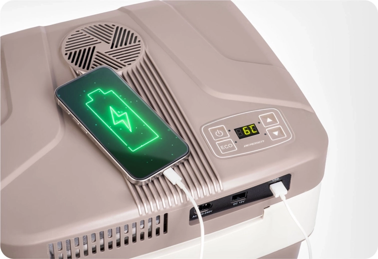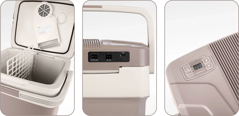Vďaka duálnemu napájaniu 12 V (auto) a 220–240 V (sieť) ju využijete na cestách aj doma. Praktické prvky, ako sú blokovanie veka pri nosení, skladacia rukoväť ako podpera a vnútorná deliaca mriežka, uľahčujú balenie aj organizáciu potravín a nápojov. Tichá prevádzka od 26 dB v ECO režime neruší oddych ani počas noci.