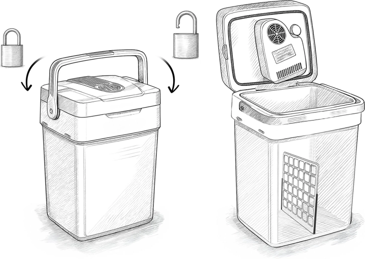 - Bezpečné prenášanie: zaistenie veka v polohe rukoväte zvisle, robustná konštrukcia.