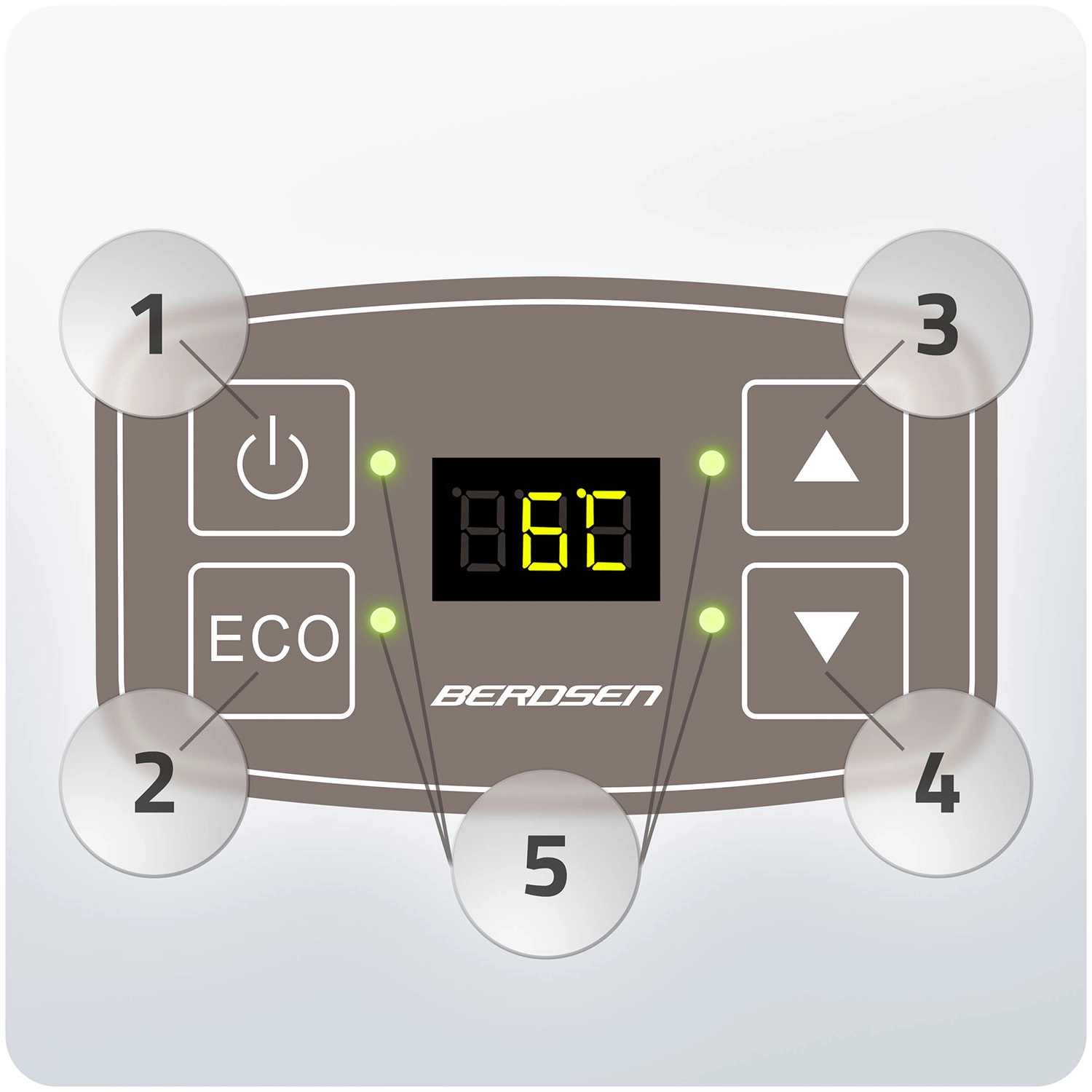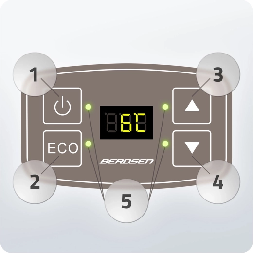 - Jednoduchá obsluha: tlačidlo ON/OFF, voľba ECO, presné nastavenie teploty, signalizačné diódy.