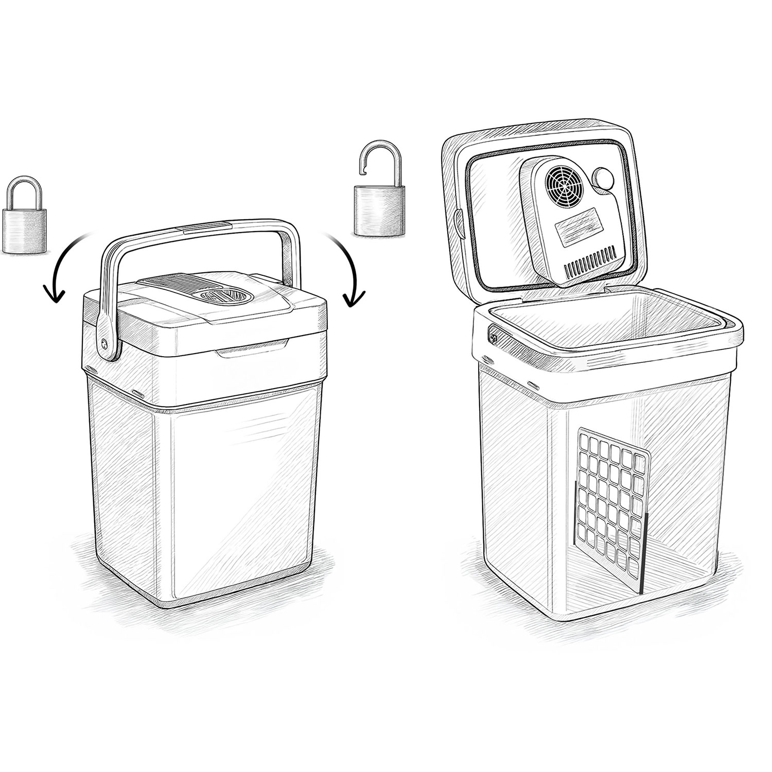 Skladacia rukoväť slúži aj ako podpera veka, zámok bráni náhodnému otvoreniu a vnútorná deliaca mriežka pomáha s organizáciou potravín a nápojov.