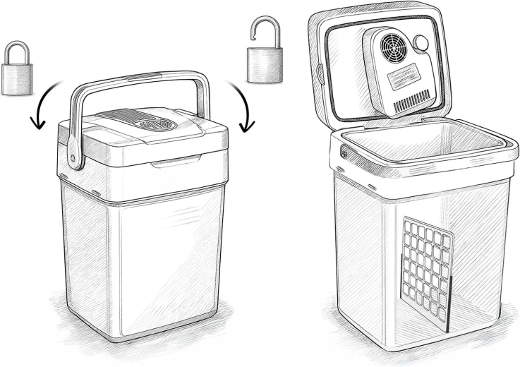 - Bezpečné prenášanie – rukoväť uzamkne veko v zatvorenej polohe.