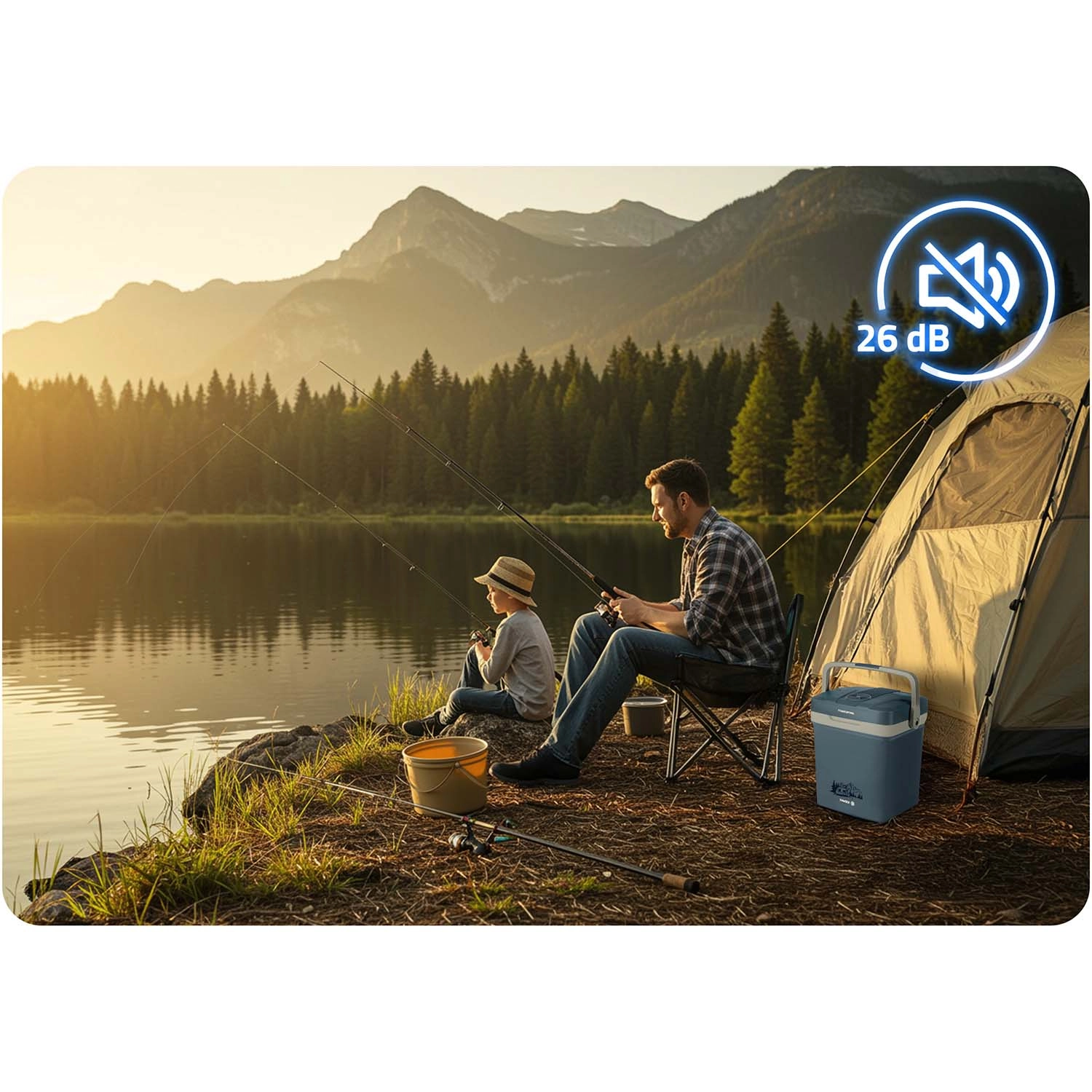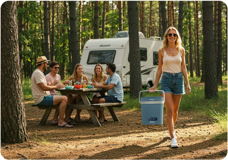 Vďaka napájaniu 12 V (auto) aj 230 V (sieť) je perfektná na cestovanie, pikniky aj dlhšie dovolenky. Veko má bezpečnostnú blokáciu pri zvislej polohe rukoväti a rukoväť možno využiť ako oporu veka pri plnení. Veľmi tichá prevádzka v ECO režime (len 26 dB) zaručí nerušený odpočinok.