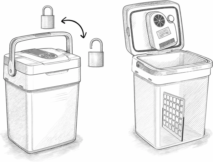 - Bezpečné prenášanie – zámok veka v polohe rukoväti hore, pevná konštrukcia.