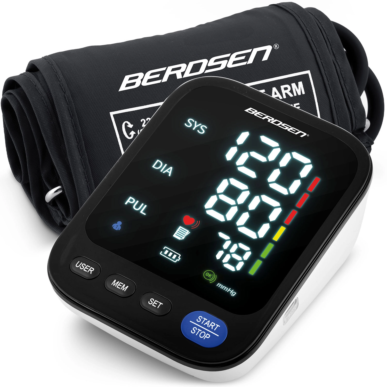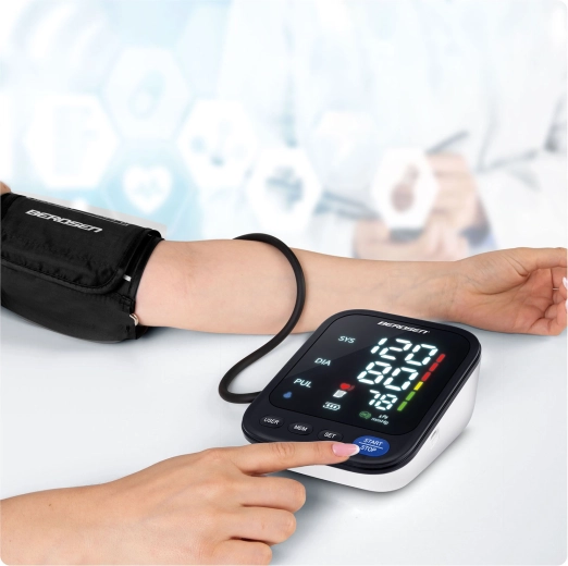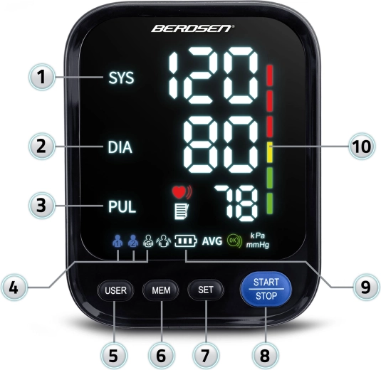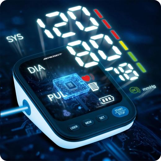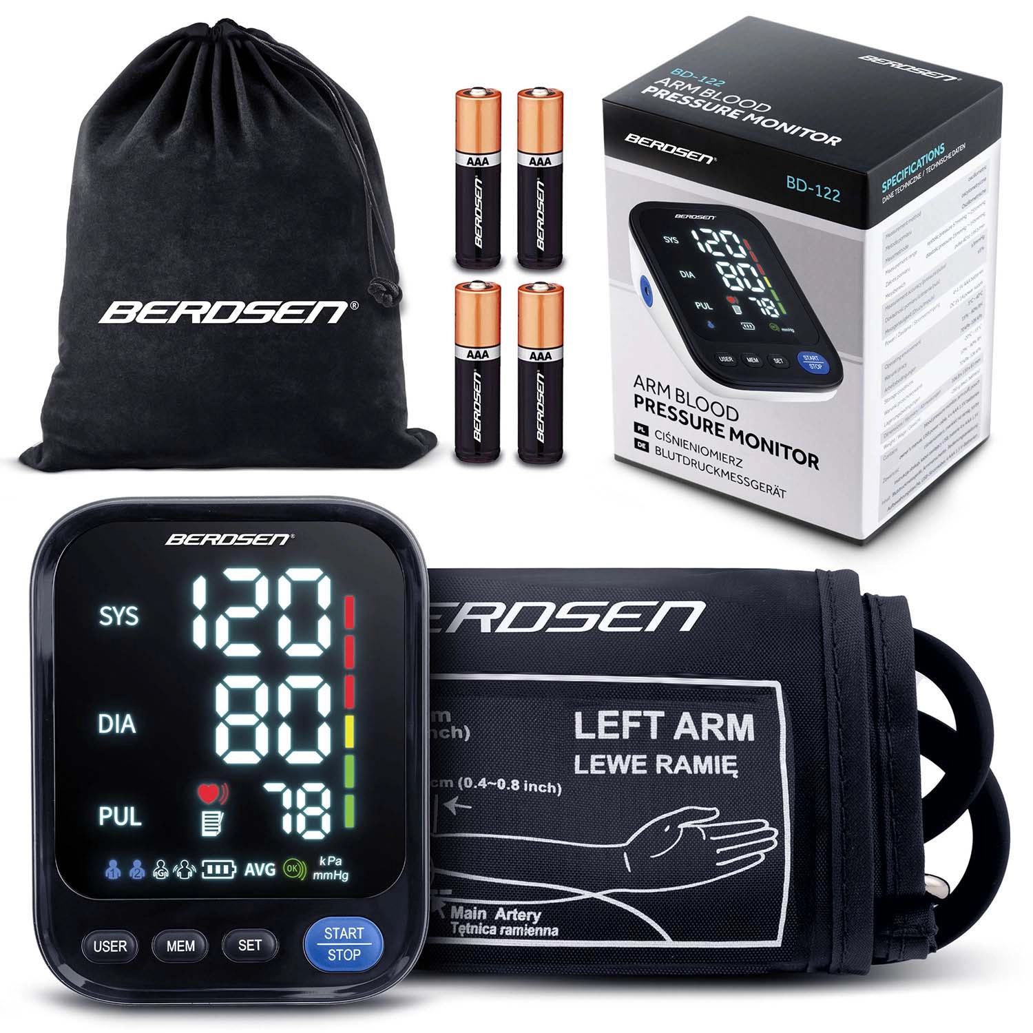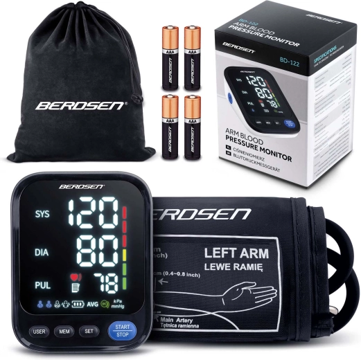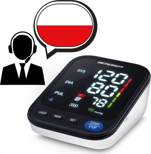 Tlakomer BERDSEN BD-122 je ideálny na každodenné domáce meranie krvného tlaku celej rodiny. Hlasové navádzanie v poľštine prevedie používateľa krok za krokom a prečíta namerané hodnoty, čo ocenia najmä seniori a osoby so zhoršeným zrakom. Prehľadný LED displej zobrazuje sys, dia a pulz, zatiaľ čo indikátor správneho nasadenia manžety a škála klasifikácie tlaku pomáhajú k presným a zrozumiteľným výsledkom.