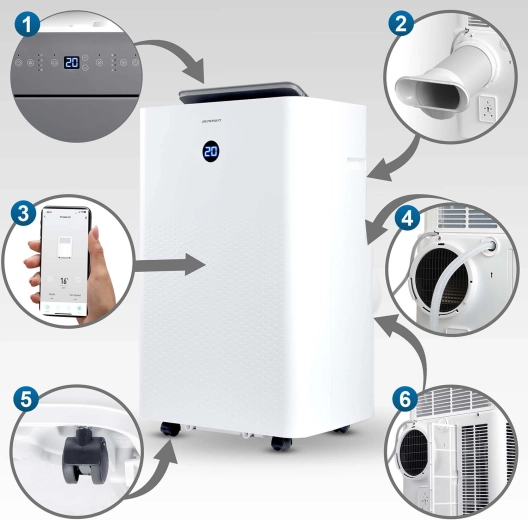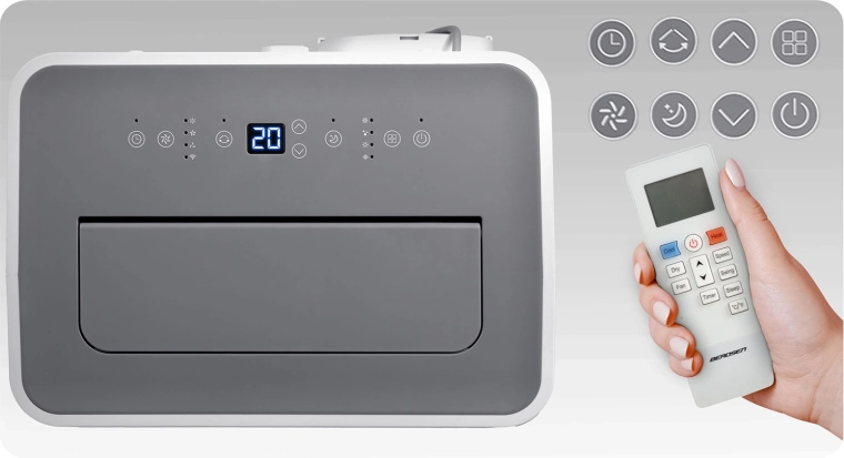 Zariadenie ponúka 5 režimov: chladenie, kúrenie, odvlhčovanie (37,5 l/24 h), ventiláciu a sleep. Vďaka hygrostatu vidíte aktuálnu vlhkosť, funkcia SWING rozvádza vzduch do priestoru a časovač 24 h s autostartom sa postará o prevádzku podľa plánu. Chladivo R290 je šetrné k životnému prostrediu (nízke ODP a GWP) a spĺňa európske normy LVD a EMC. Robustný kompresor RECHI prináša vysokú spoľahlivosť, tichý chod a efektívnu spotrebu energie.