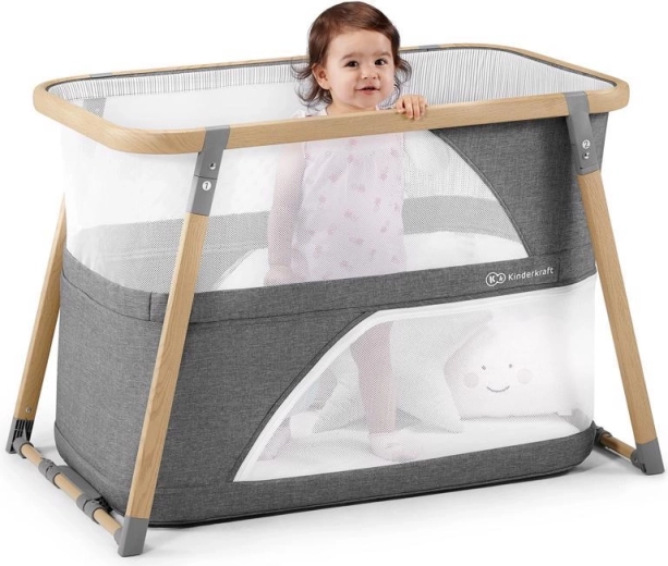 Multifunkčná postieľka 4v1 KIDERKRAFT Sofi v elegantnej sivej farbe kombinuje postieľku, cestovnú postieľku, ohrádku a hojdačku. Ponúka rýchle zloženie do 5 sekúnd, ľahký hliníkový rám v dekore dreva, priedušné sieťované boky a kvalitný penový matrac pre bezpečný a pohodlný spánok aj hranie doma aj na cestách.