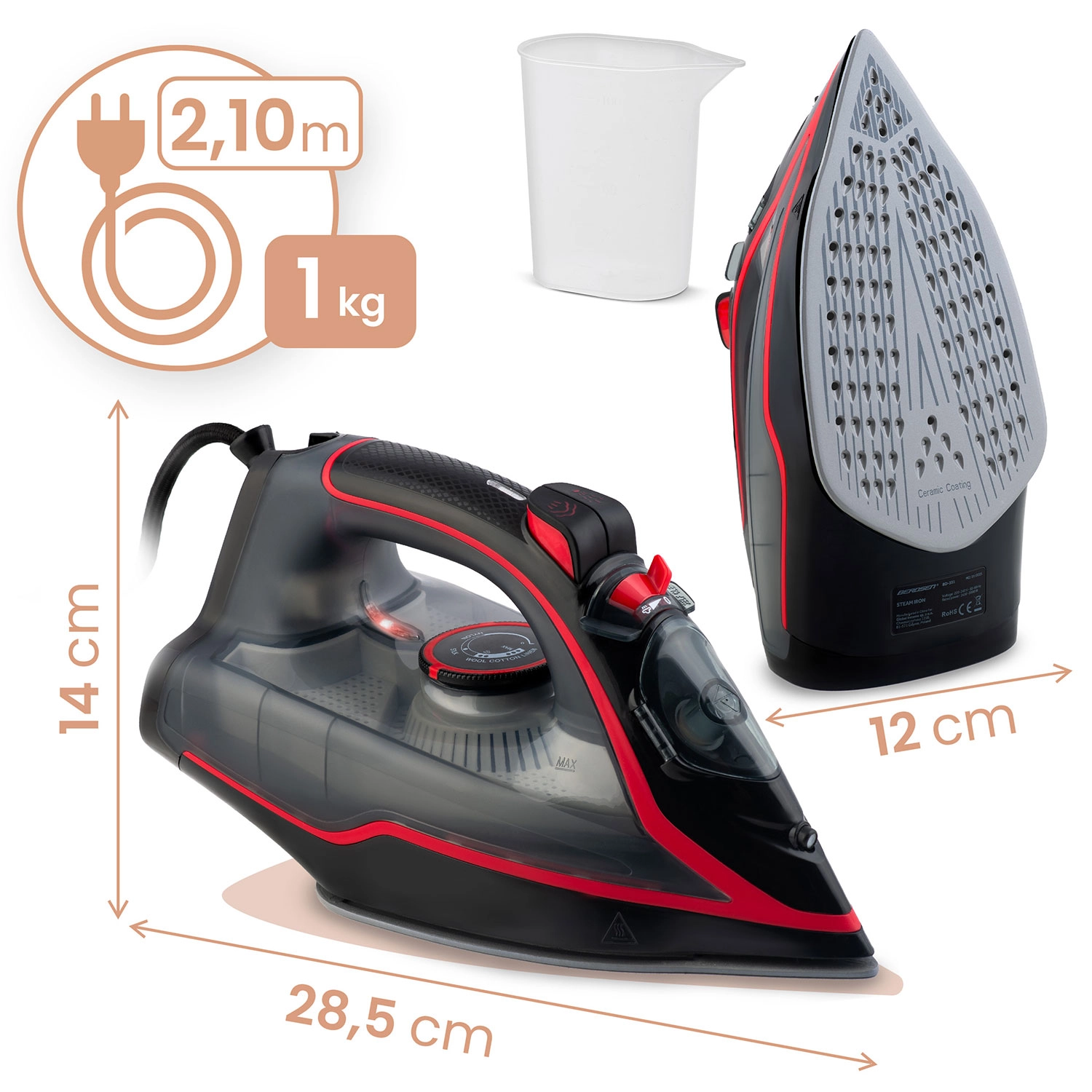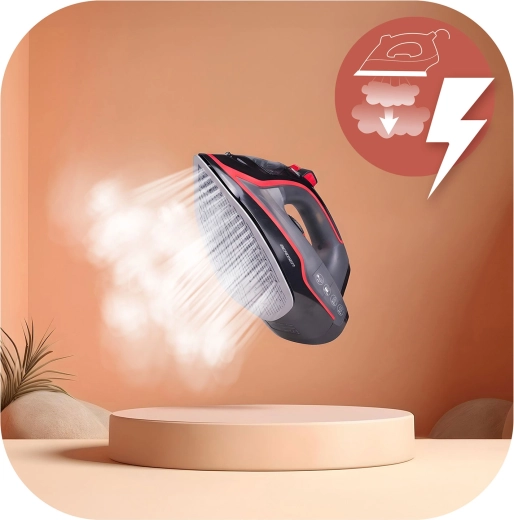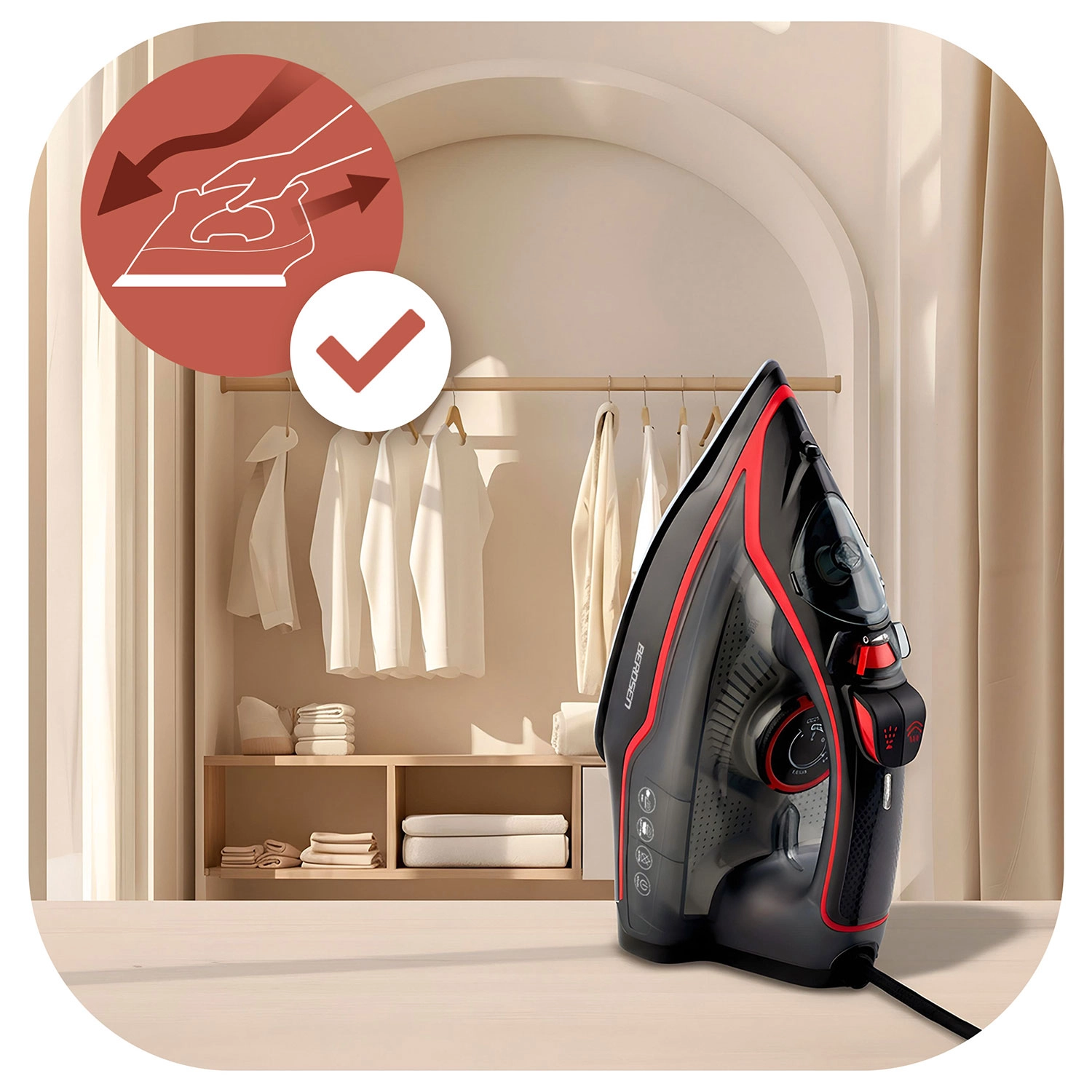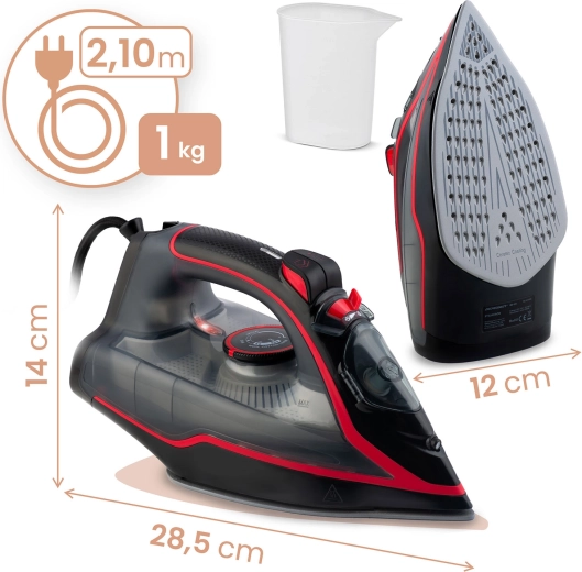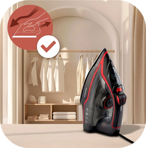 - Keramická žehliaca plocha – hladký sklz, rovnomerná para a odolnosť proti poškrabaniu.