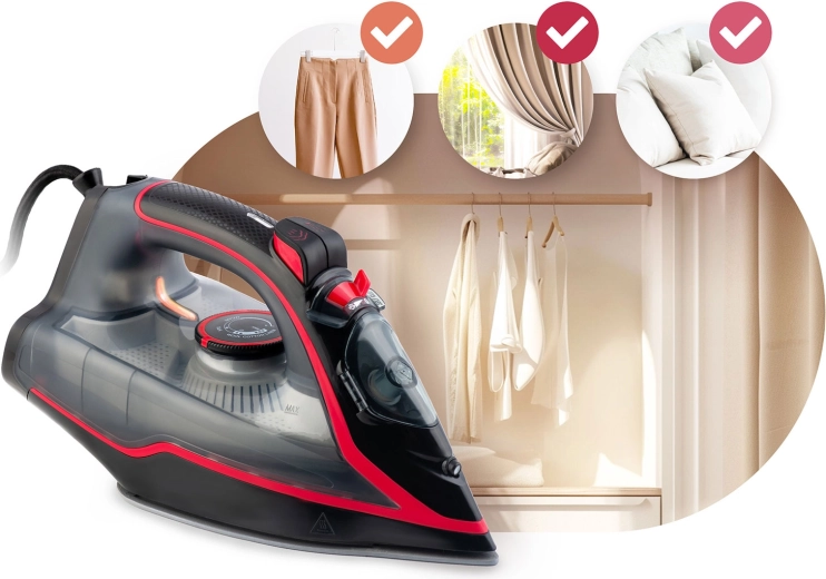 - Regulácia pary a teploty – optimálne nastavenie pre jemné aj hrubšie tkaniny.
