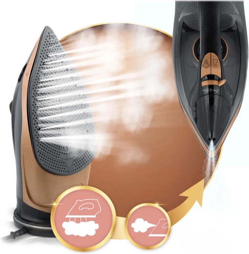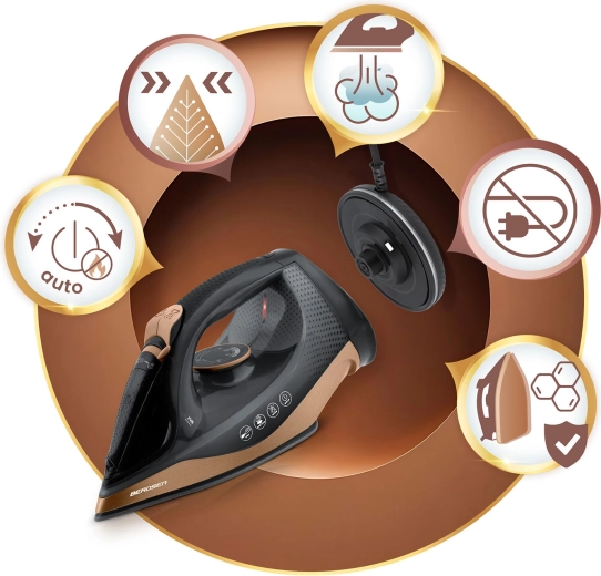 Hladké kĺzanie, rovnomerná distribúcia pary a jednoduché žehlenie aj na ťažšie dostupných miestach vďaka presnej špičke.