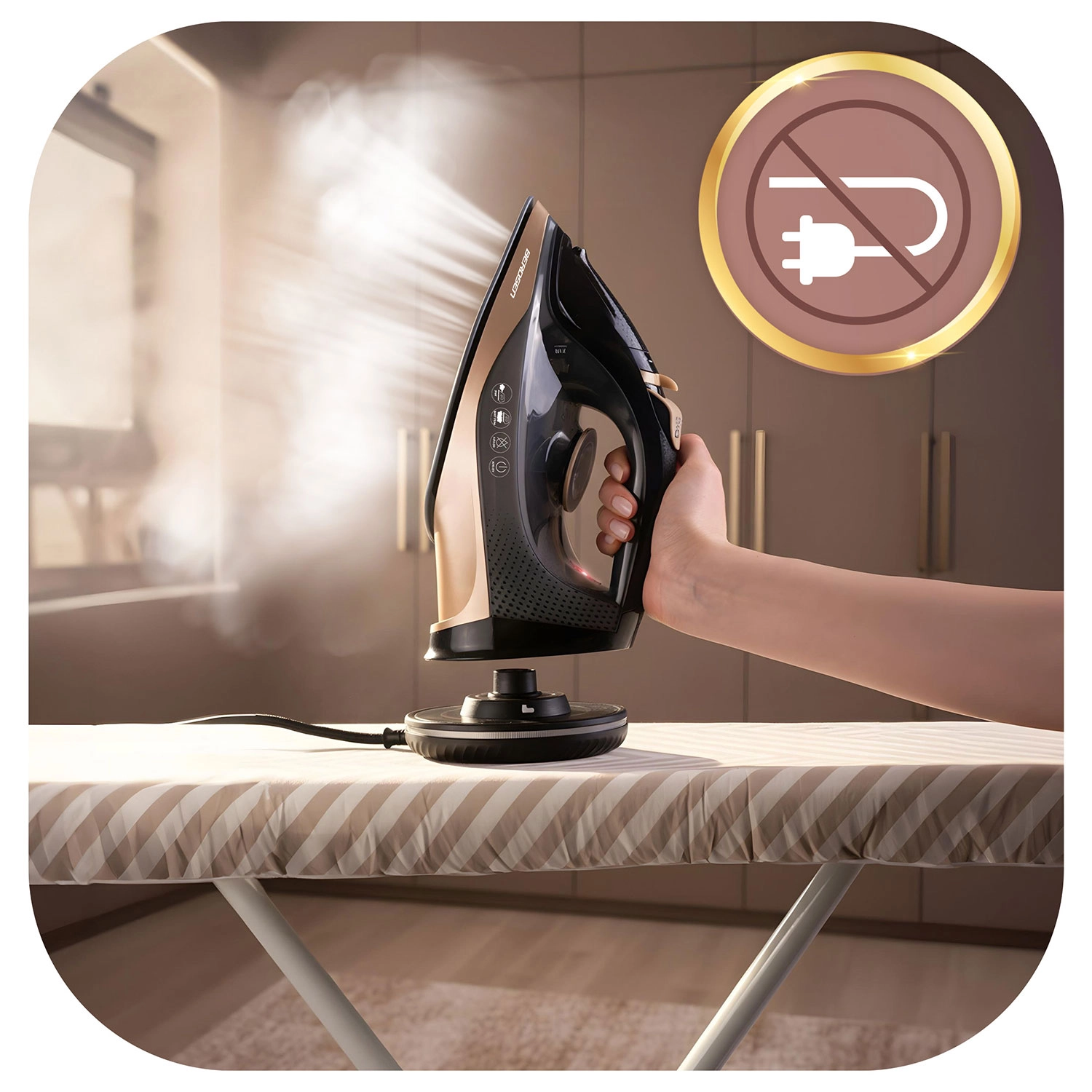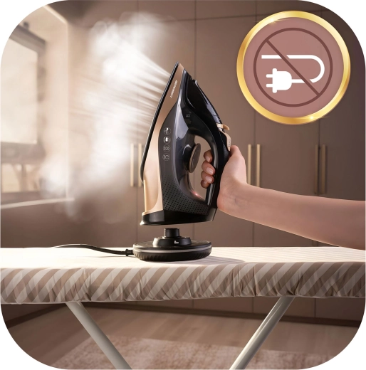 Používajte žehličku voľne bez kábla alebo uzamknite základňu a žehlite ako s klasickým modelom – vždy stabilná teplota a plynulá práca.