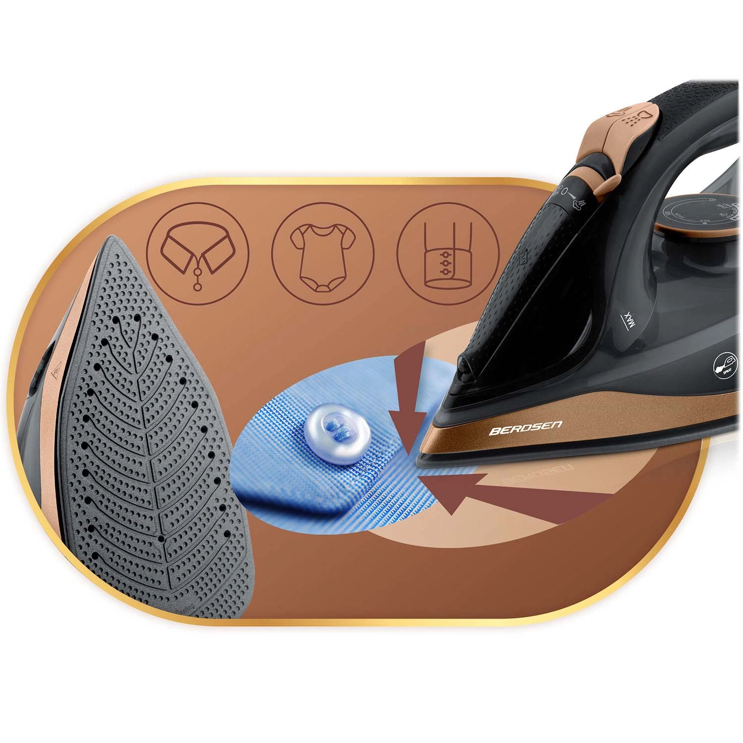 Žehlička Berdsen kombinuje silný výkon 2600 W a hladkú keramickú plochu s mikrokanálikmi pre rovnomernú distribúciu pary. S vertikálnym naparovaním vyžehlíte záclony či odevy na ramienku bez potreby žehliacej dosky. Nádržka na vodu s objemom 320 ml a praktický rozprašovač umožňujú cielené zvlhčenie aj tých najodolnejších záhybov.
