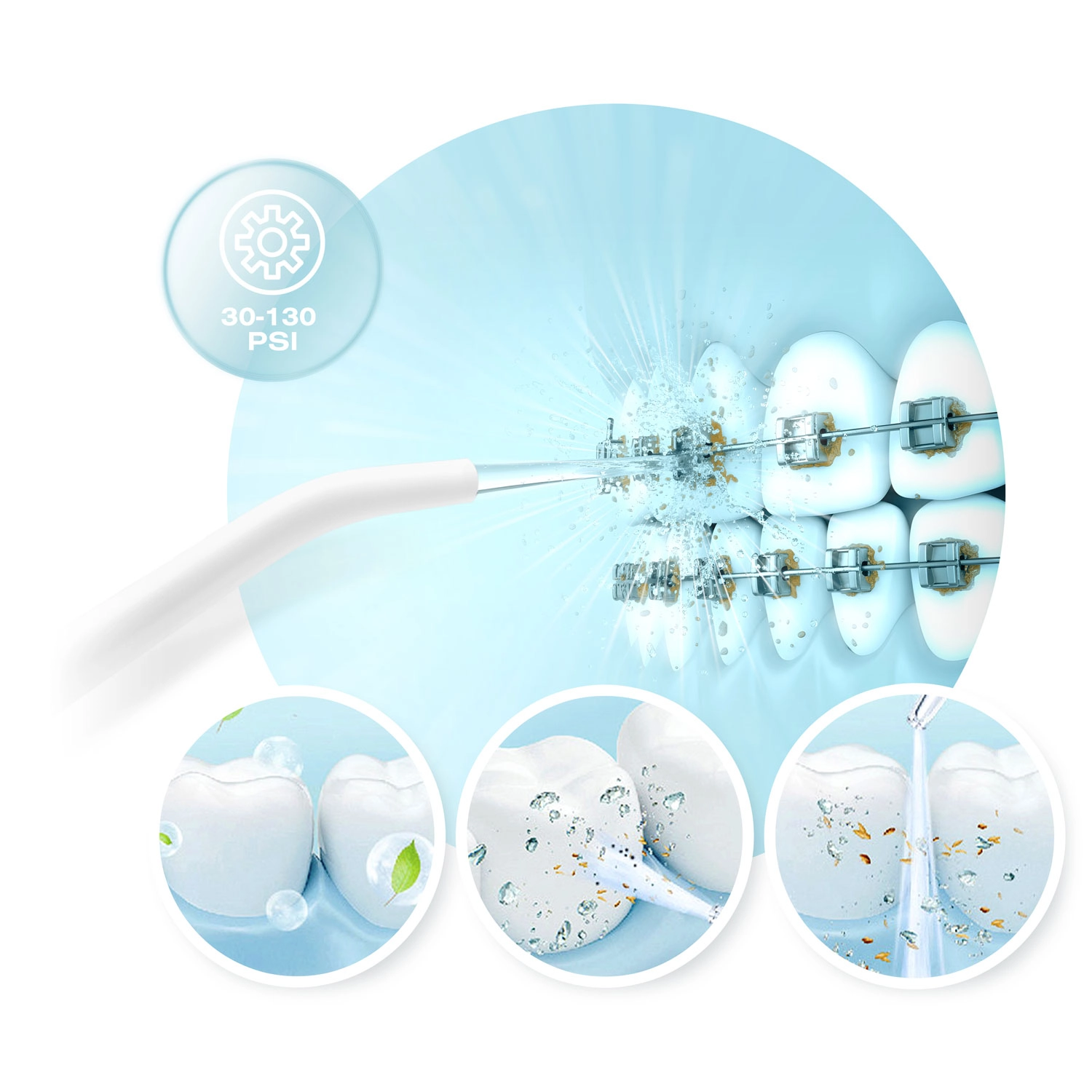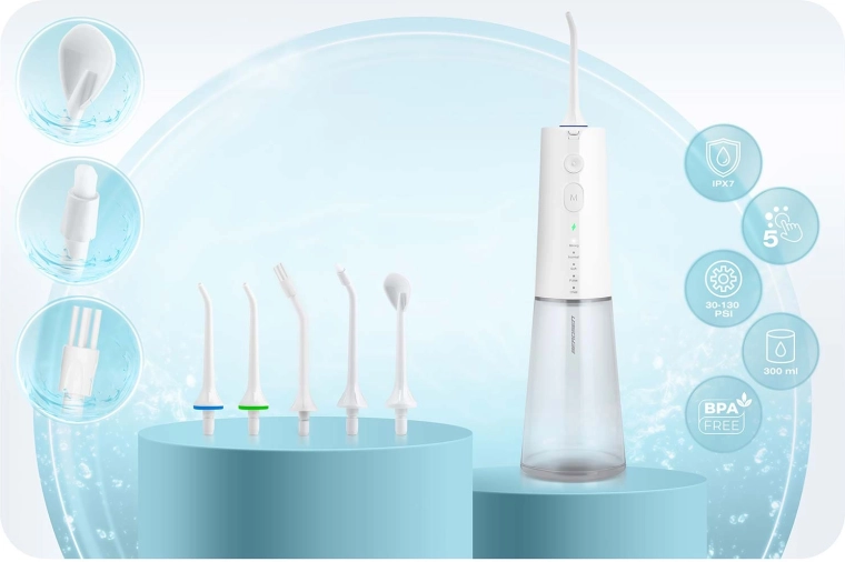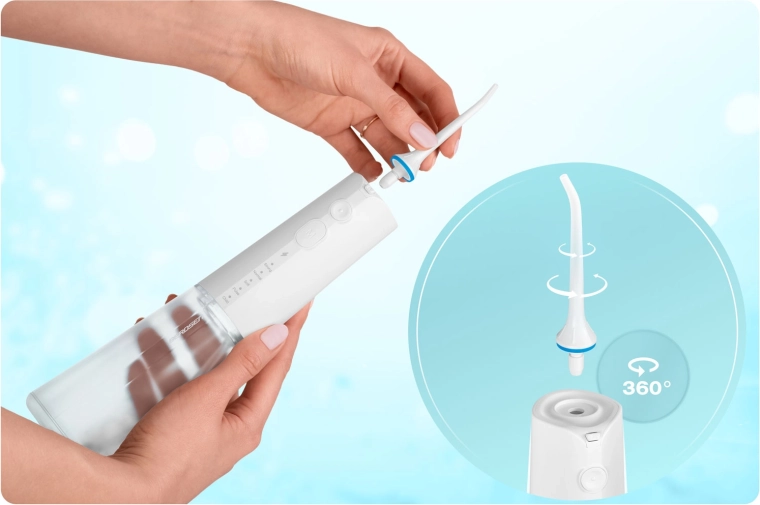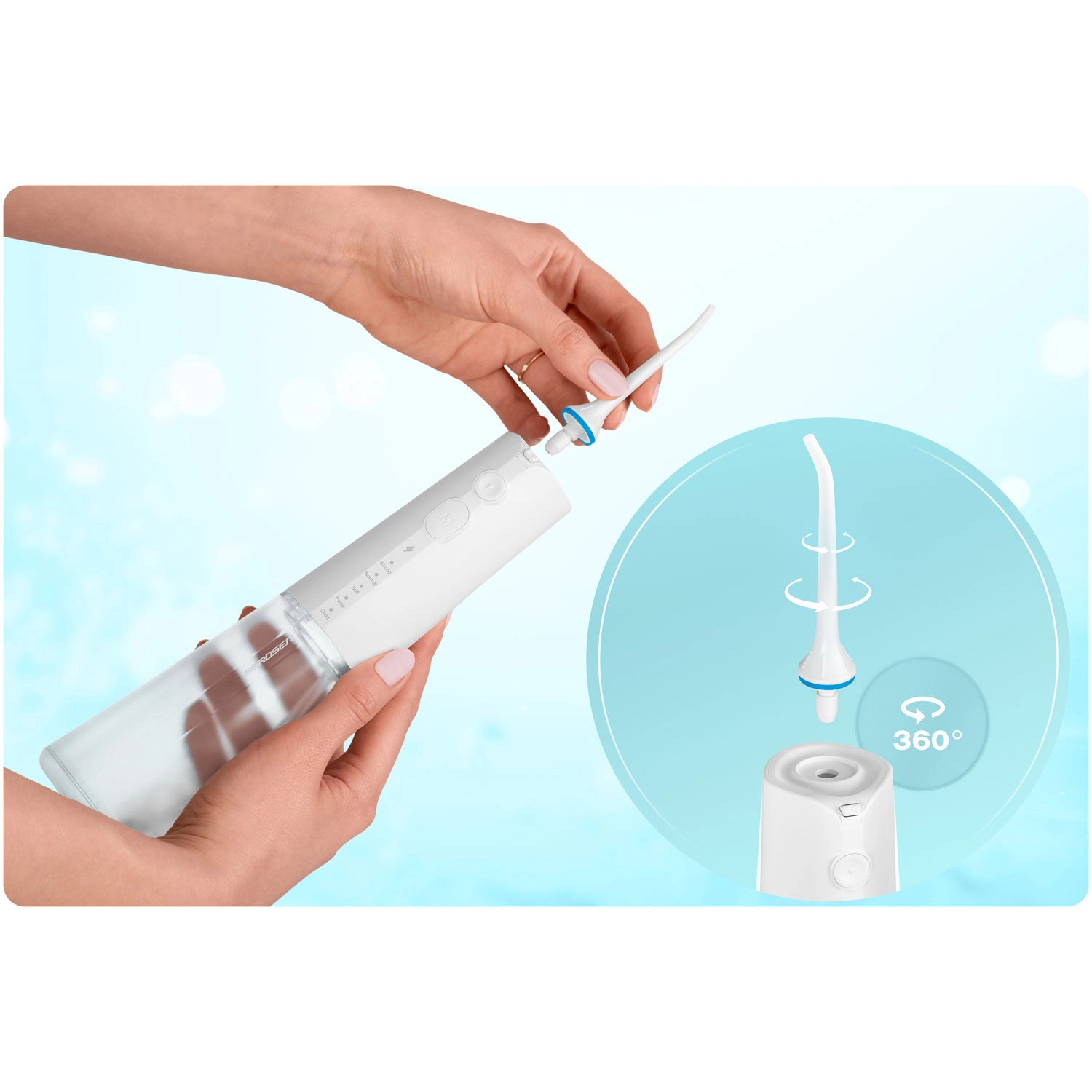 V balení nájdete päť nadstavcov na kompletnú hygienu ústnej dutiny: štandardné trysky na každodenné použitie, nadstavec na jazyk pre svieži dych, ortodontickú trysku pre strojčeky a špeciálnu trysku na čistenie parodontálnych vačkov (odporúča sa používať pri nízkom tlaku). Otočná hlavica 360° uľahčuje dosiahnutie všetkých miest v ústach a vodeodolnosť IPX7 zvyšuje bezpečnosť používania v kúpeľni.