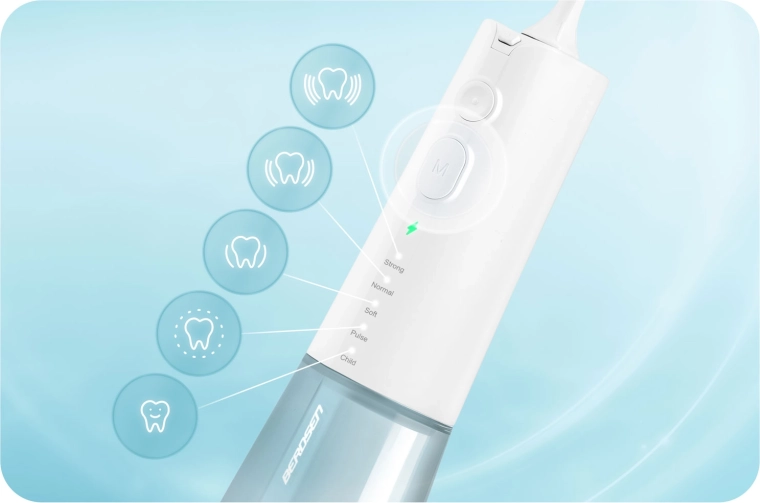 Bezdrôtový irigátor Berdsen účinne odstraňuje nečistoty a zvyšky jedla z medzizubných priestorov a pozdĺž línie ďasien pomocou silného, no šetrného vodného prúdu. Päť režimov (Strong, Normal, Soft, Pulse, Child) vám umožní prispôsobiť tlak a rytmus čistenia citlivým ďasnám, nositeľom strojčekov aj deťom. Väčšia nádržka s objemom 300 ml zabezpečuje dlhšie čistenie bez častého dolievania vody.
