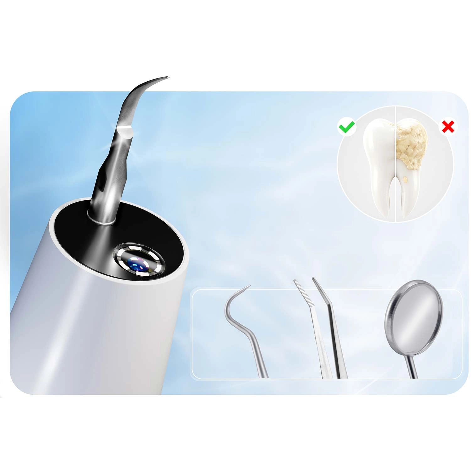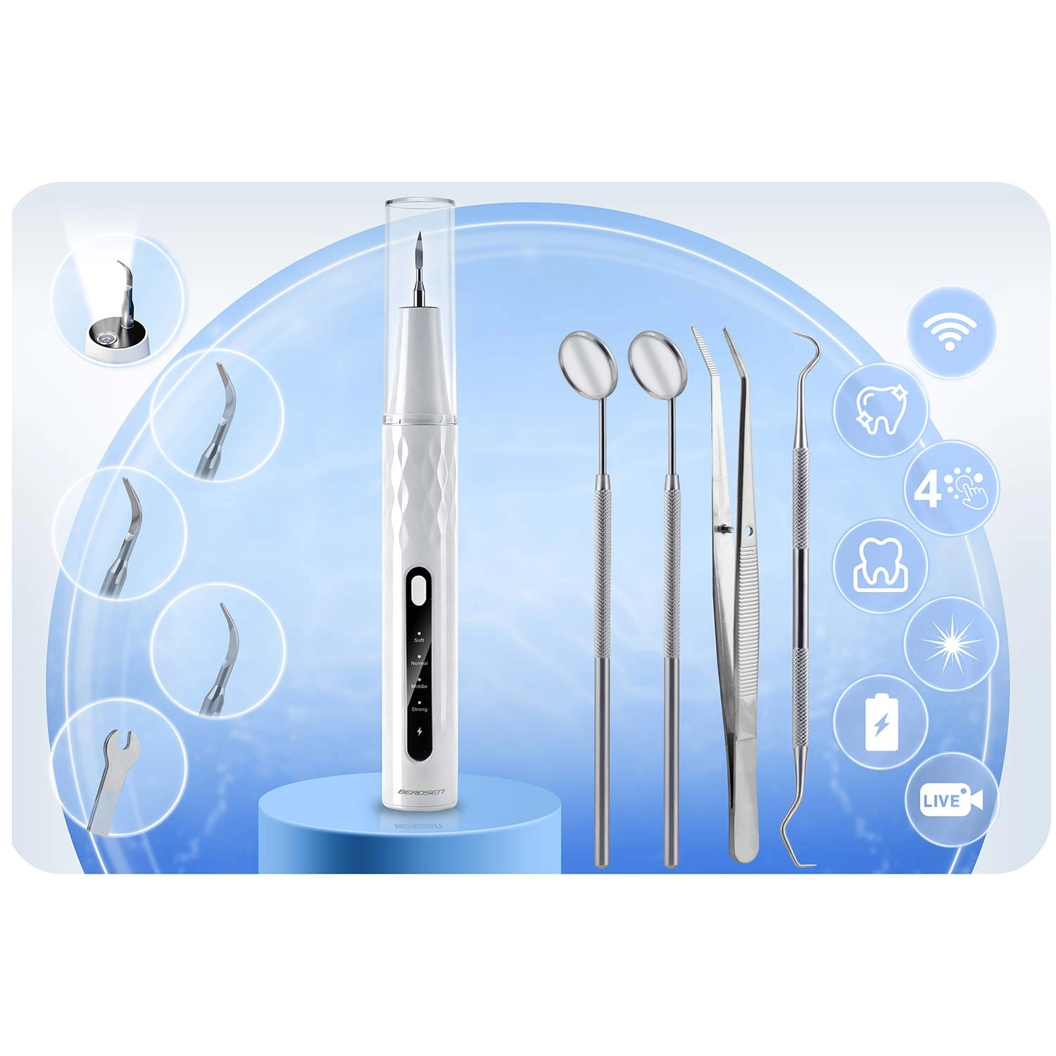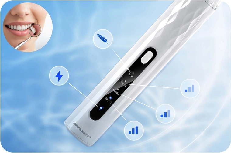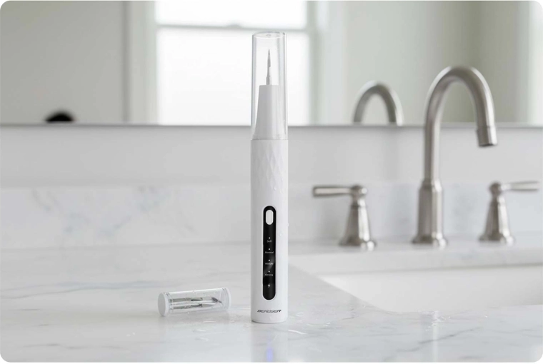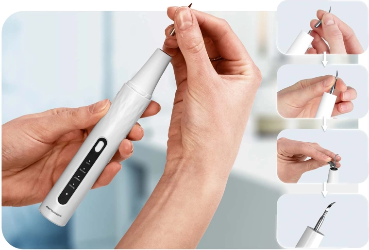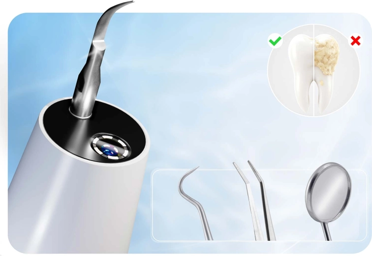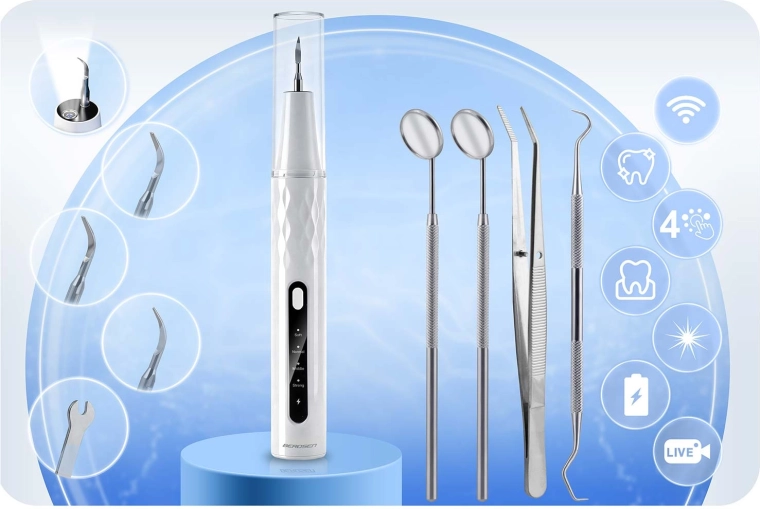 Domáca starostlivosť o zuby na profesionálnej úrovni. Ultrazvukový skaler BERDSEN s integrovanou 2 Mpx kamerou a LED osvetlením vám umožní presne vidieť miesta so zubným kameňom a povlakom. Ponúka 4 pracovné režimy (35–45 kHz) pre všetky citlivosti, automatické zastavenie pri dotyku mäkkej tkaniny, vodotesnosť IPX7, dlhú výdrž batérie s nabíjaním USB‑C a bohaté príslušenstvo vrátane 4 vymeniteľných hlavíc a sady nerezových dentálnych nástrojov. Ideálne na bezpečné a účinné čistenie v pohodlí domova.