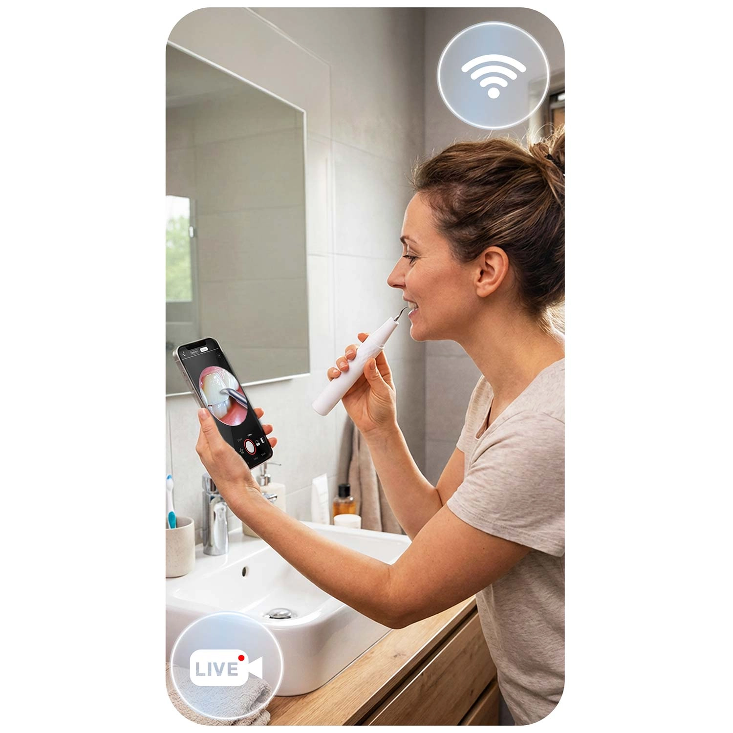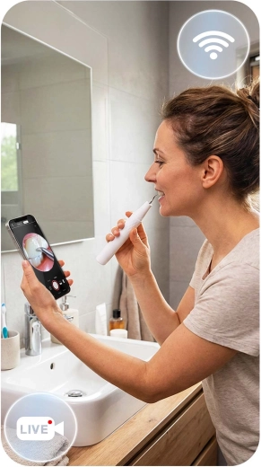 Vidíte, čo čistíte – úplná kontrola a presnosť. Integrovaná 2 Mpx kamera s LED diódami prenáša obraz v reálnom čase do mobilnej aplikácie. Ľahko tak identifikujete kameň, pigmentácie aj ťažko dostupné miesta a odstránite iba to, čo je potrebné – bez zbytočného podráždenia a hádania.