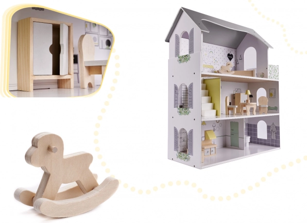 Objavte čaro dreveného domčeka pre bábiky, ktorý sa stane stredom pozornosti každej detskej hry. Dom má tri poschodia a je vybavený štýlovým dreveným nábytkom, ktorý dodá každému izbe jedinečný vzhľad. Vyberte si zo záhrady, kuchyne, spálne a obývacej izby, ktoré sú dokonale navrhnuté pre hranie s bábikami.