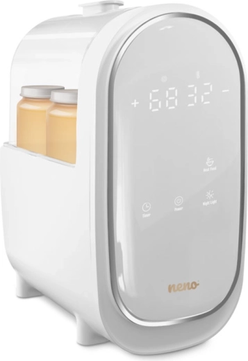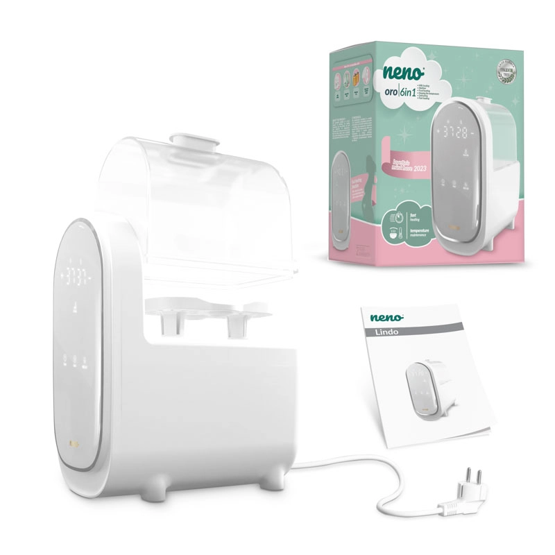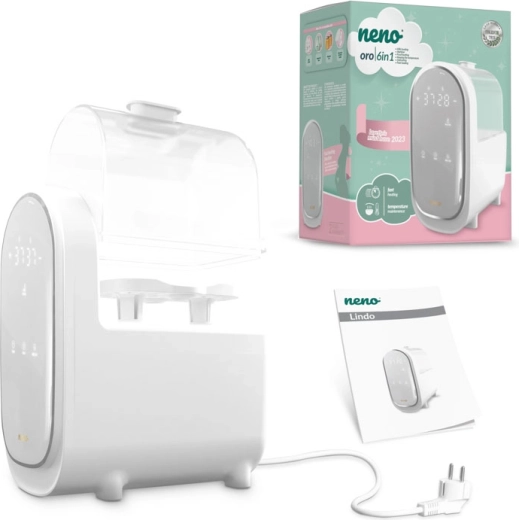 Kompaktný a elegantný Neno Lindo 6v1 je multifunkčné zariadenie na starostlivosť o detskú výživu a hygienu. Ponúka sterilizáciu fliaš, cumlíkov a hryzátok, presné ohrievanie mlieka a pokrmov, rozmrazovanie a udržiavanie teploty. Vďaka dotykovému panelu, LED podsvieteniu a chytrým režimom je obsluha rýchla, tichá a bezpečná aj v noci. Štíhle rozmery šetria miesto na linke a zmestí sa aj do zásuvky.