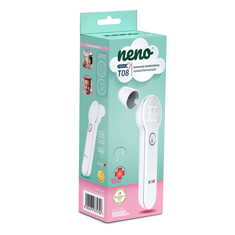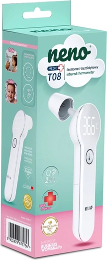 NENO Medic T08 je moderný bezkontaktný teplomer navrhnutý na bezpečné a hygienické meranie bez prebúdzania spiacich detí. Využíva presnú infračervenú technológiu, ktorá poskytne výsledok za 1 sekundu s presnosťou ±0,2 °C. Vďaka veľkému podsvietenému LED displeju ľahko prečítate hodnotu aj v noci.