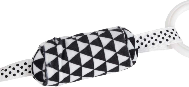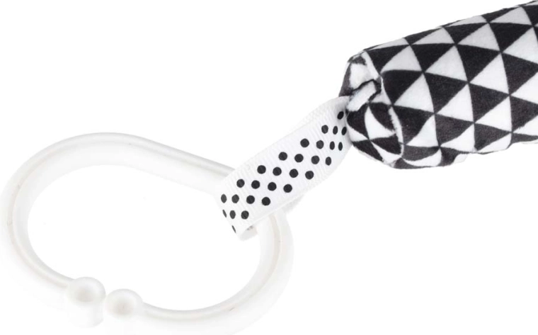 Praktický klip/krúžok umožní rýchle pripnutie k madlu kočíka, autosedačky alebo k okraju postieľky. Hračka tak zostane vždy po ruke.