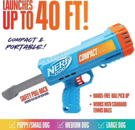 Pripravte sa, namierte a aportujte s blasterom NERF DOG, ktorý vystrelí loptičky až do 12 metrov a zaistí vášmu psovi skvelý tréning bez námahy pre vašu ruku. Vďaka kompaktným rozmerom sa ľahko používa, prenáša aj skladuje a umožňuje hygienické zdvíhanie loptičiek bez použitia rúk. Súčasťou balenia sú 2 odolné tenisové loptičky štandardnej veľkosti 2,5".