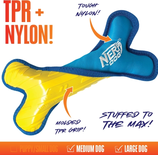 Kosť Nerf Dog prináša inteligentnú kombináciu materiálov pre vyváženie odolnosti a pohodlia. Vo vnútri sa nachádza robustné TPR jadro pre dlhú životnosť, zatiaľ čo vonkajší plyšový nylon je šetrný k zubom a ďasnám. Vnútorná polyetylénová výplň dodáva objem aj lákavú textúru, ktorá motivuje psov k hre.
