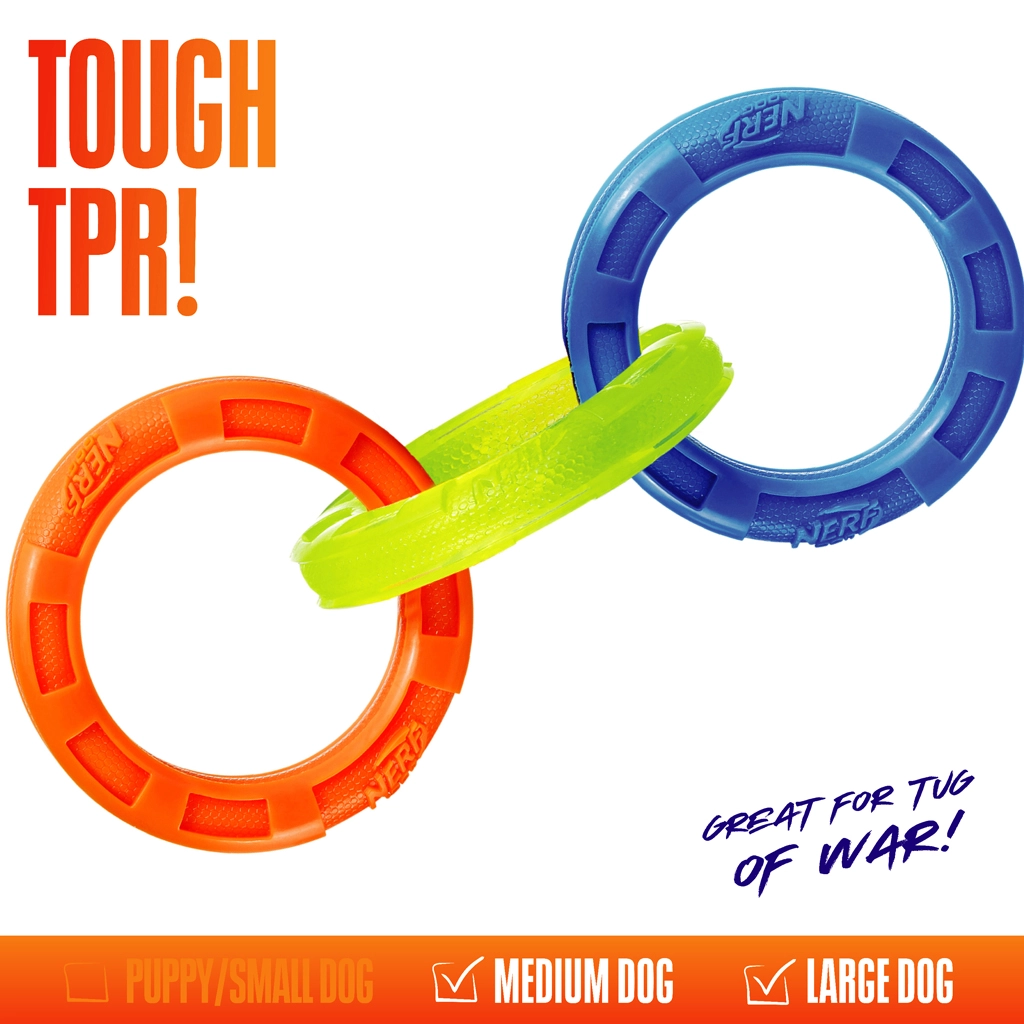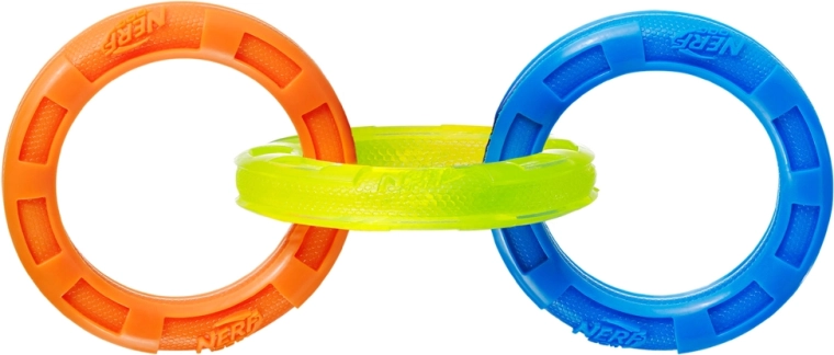 Odolná interaktívna hračka pre psov s tromi prepojenými krúžkami na preťahovanie a aport. Vďaka dĺžke 26,7 cm je ideálna pre stredné a veľké plemená. Vodeodolné prevedenie, vrúbkovaná textúra pre zdravé zuby a ďasná a ľahké, ale mimoriadne odolné materiály Nerf Tough zaručujú dlhú zábavu a bezpečnosť pri hre vonku aj doma.
