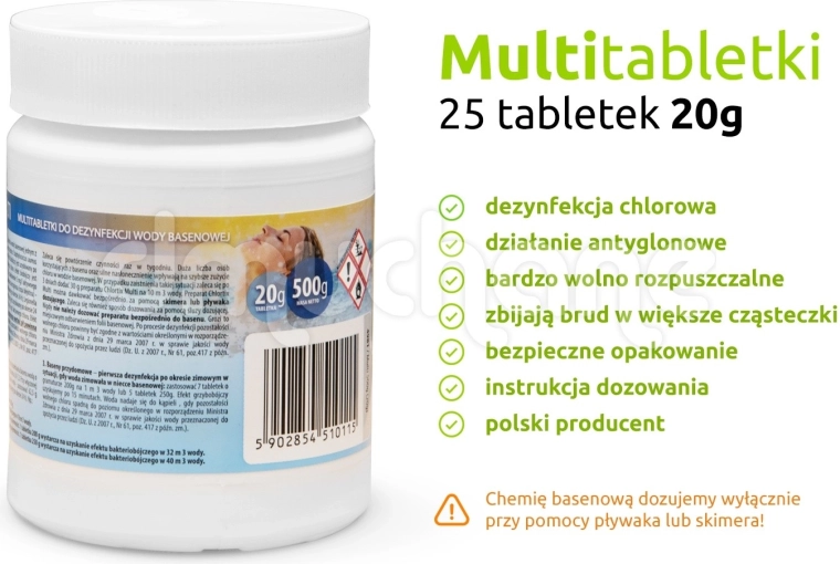 Multifunkčné tablety predstavujú pohodlnú a účinnú starostlivosť o vodu vo vašom záhradnom bazéne. Vďaka stabilnému uvoľňovaniu chlóru udržiavajú optimálnu hygienu, pôsobia glonostaticky proti riasam a zlepšujú čírosť vody podporou flokulácie, teda zhlukovaním jemných nečistôt pre jednoduchšiu filtráciu.
