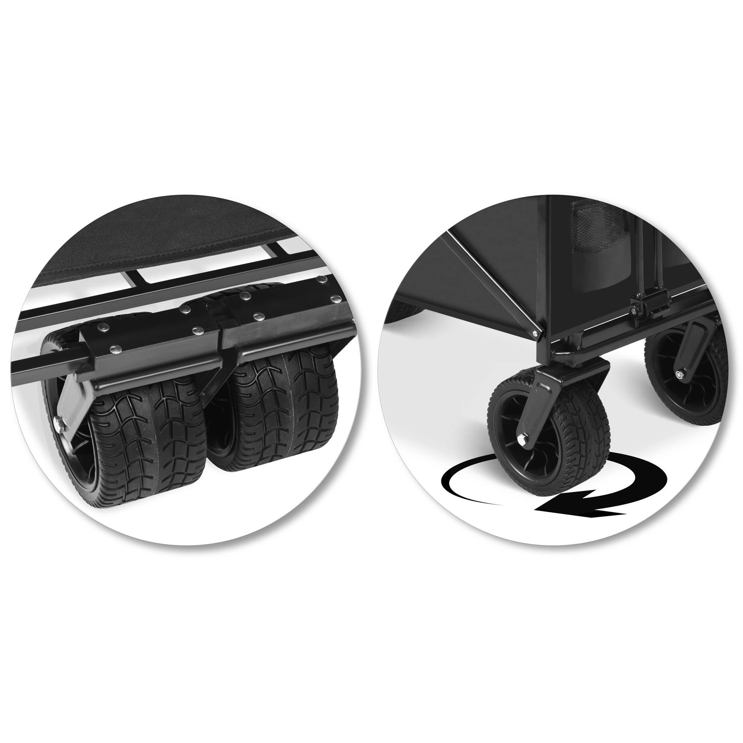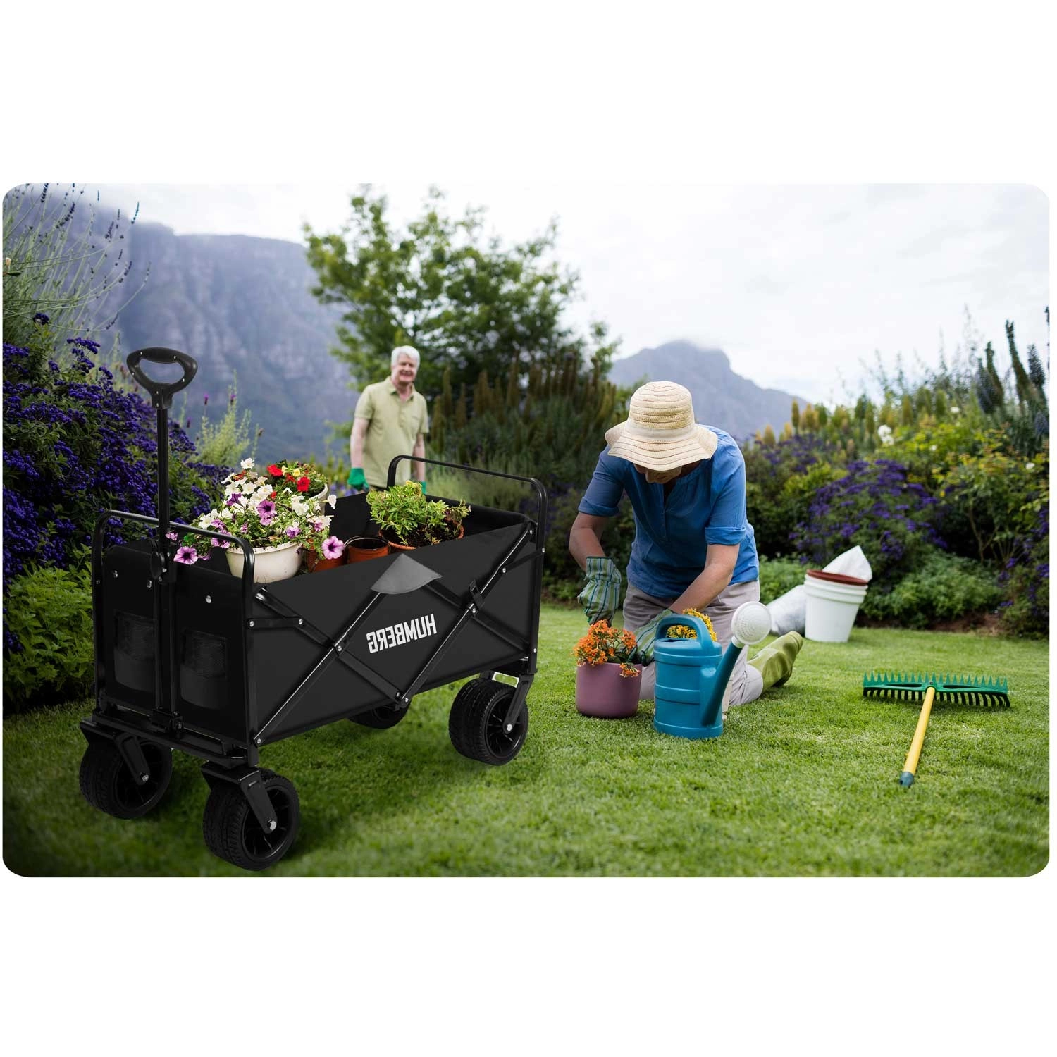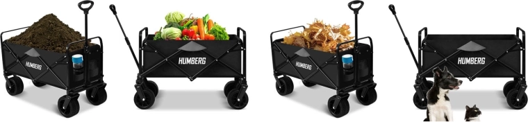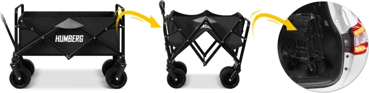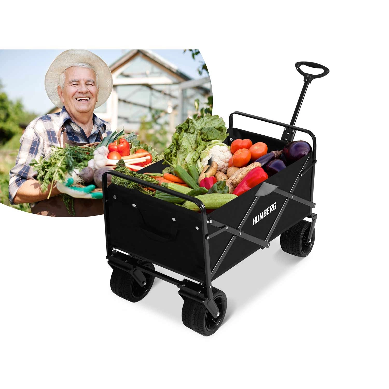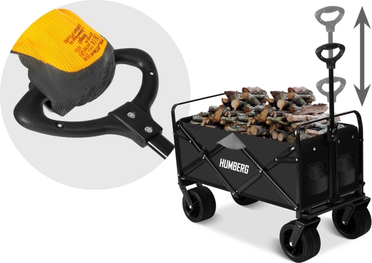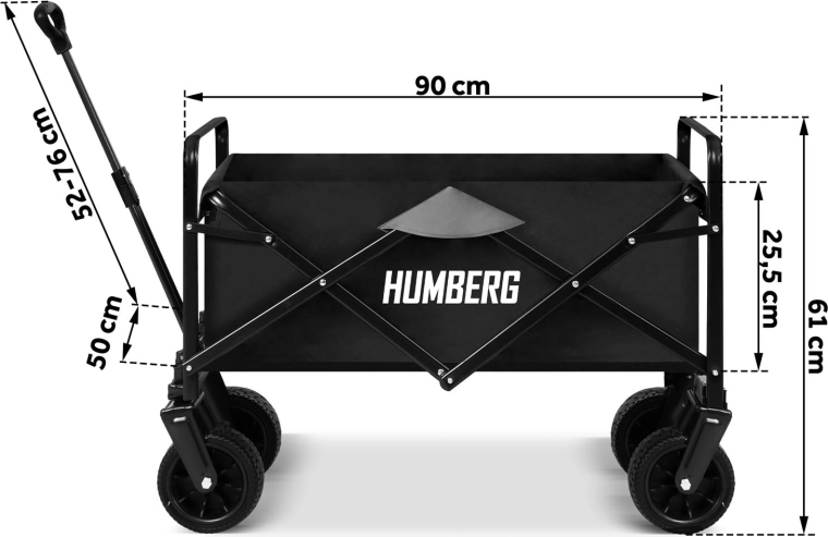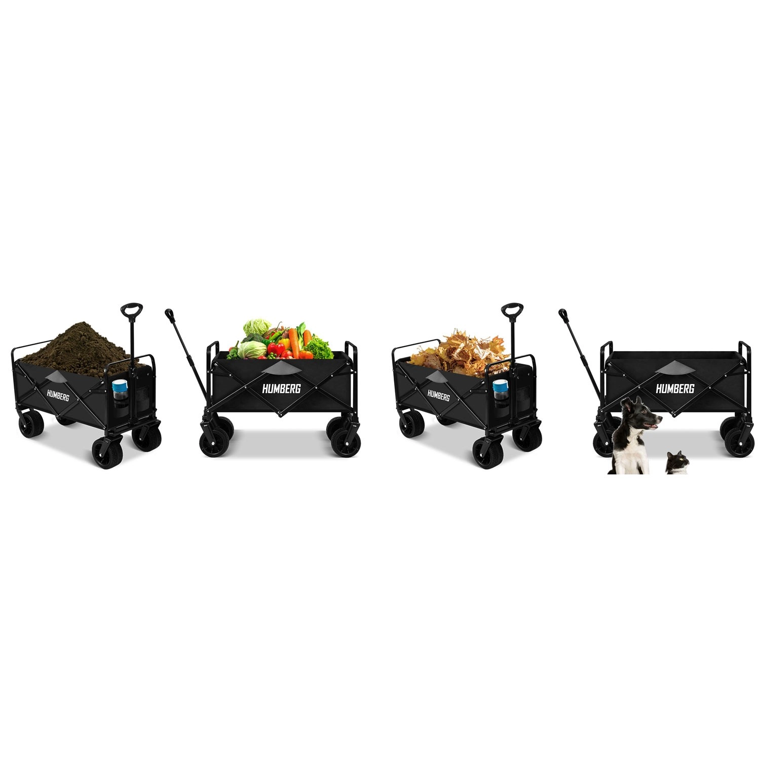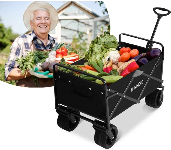 Praktický skladací vozík HUMBERG s objemom 100 l a nosnosťou až 120 kg uľahčí prepravu nákladu na záhrade, na pláži aj pri cestovaní. Vďaka otočným kolesám 360°, teleskopickej rukoväti a stabilnej oceľovej konštrukcii sa ľahko ovláda aj v nerovnom teréne. Rýchle zloženie, odolná textília a praktické vrecká na nápoje z neho robia nenahraditeľného pomocníka na každý deň.