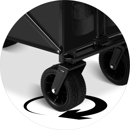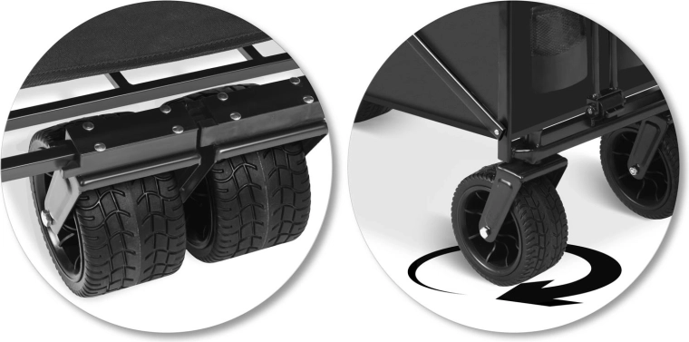 Predné otočné kolesá 360° a možnosť prisunutia zadných kolies pre vyššiu stabilitu zabezpečujú plynulú jazdu aj na nerovnom povrchu.