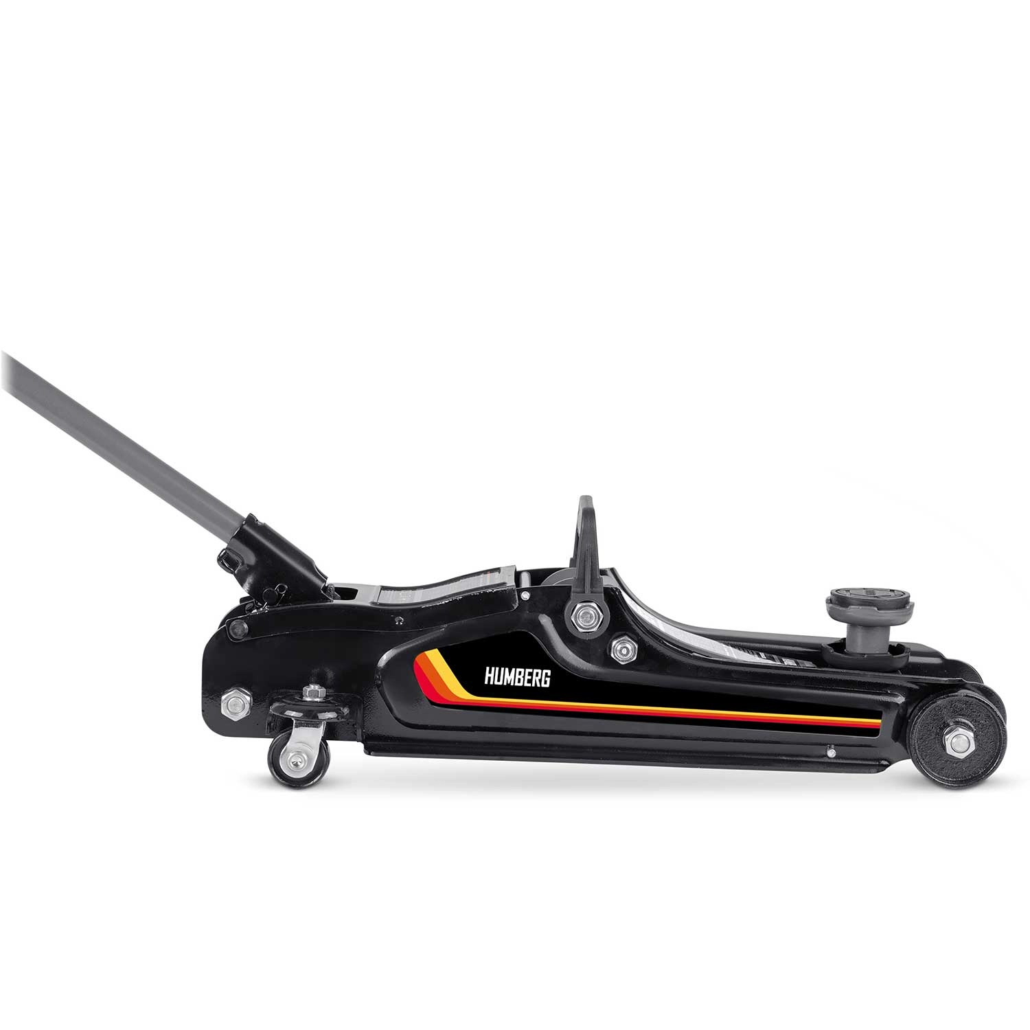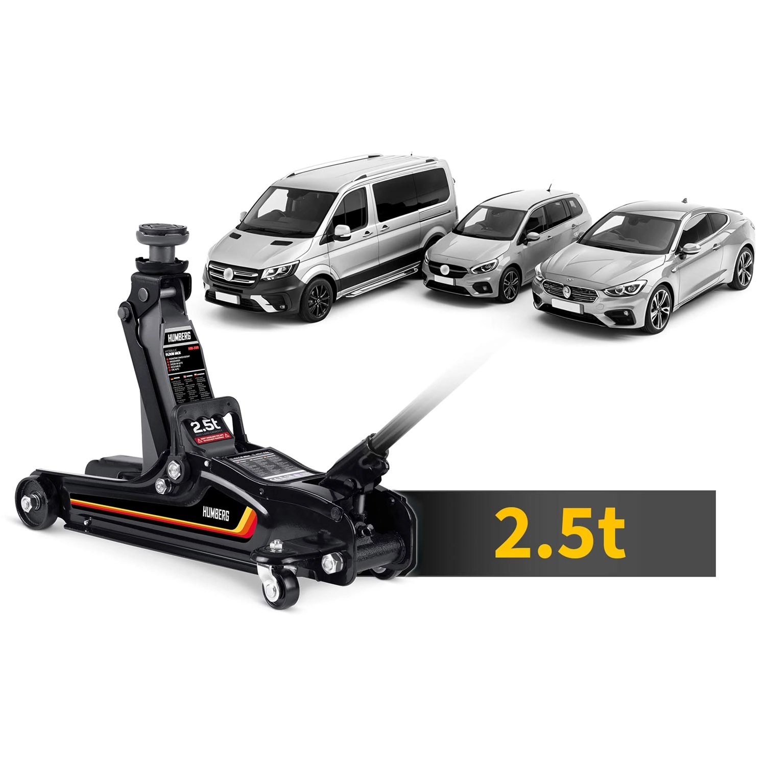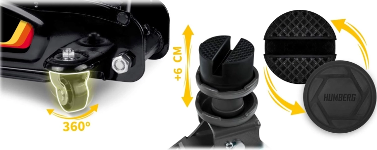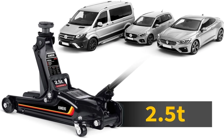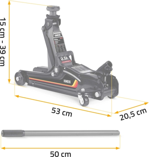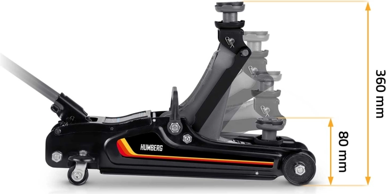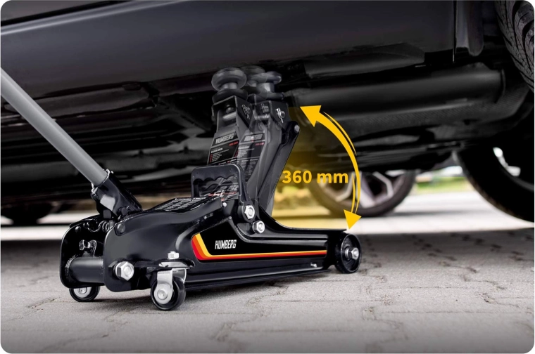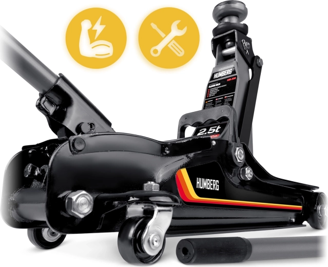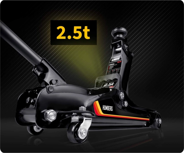 Nízkoprofilový zdvihák HUMBERG 2,5 t je ideálnou voľbou pre rýchle a bezpečné zdvíhanie osobných áut, multivanov i menších dodávok do hmotnosti 2 500 kg. Nízky profil so zdvihom 80–360 mm umožní prácu aj pri športovejšie posadených autách. Jednopiestová hydraulická jednotka zabezpečuje plynulé a efektívne zdvíhanie, zatiaľ čo pretlakový bezpečnostný ventil chráni pred preťažením.