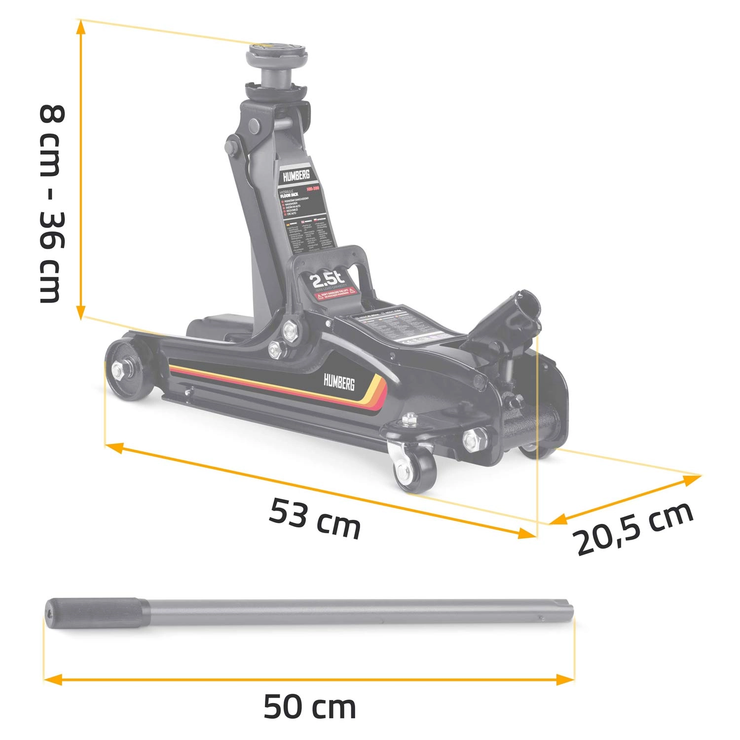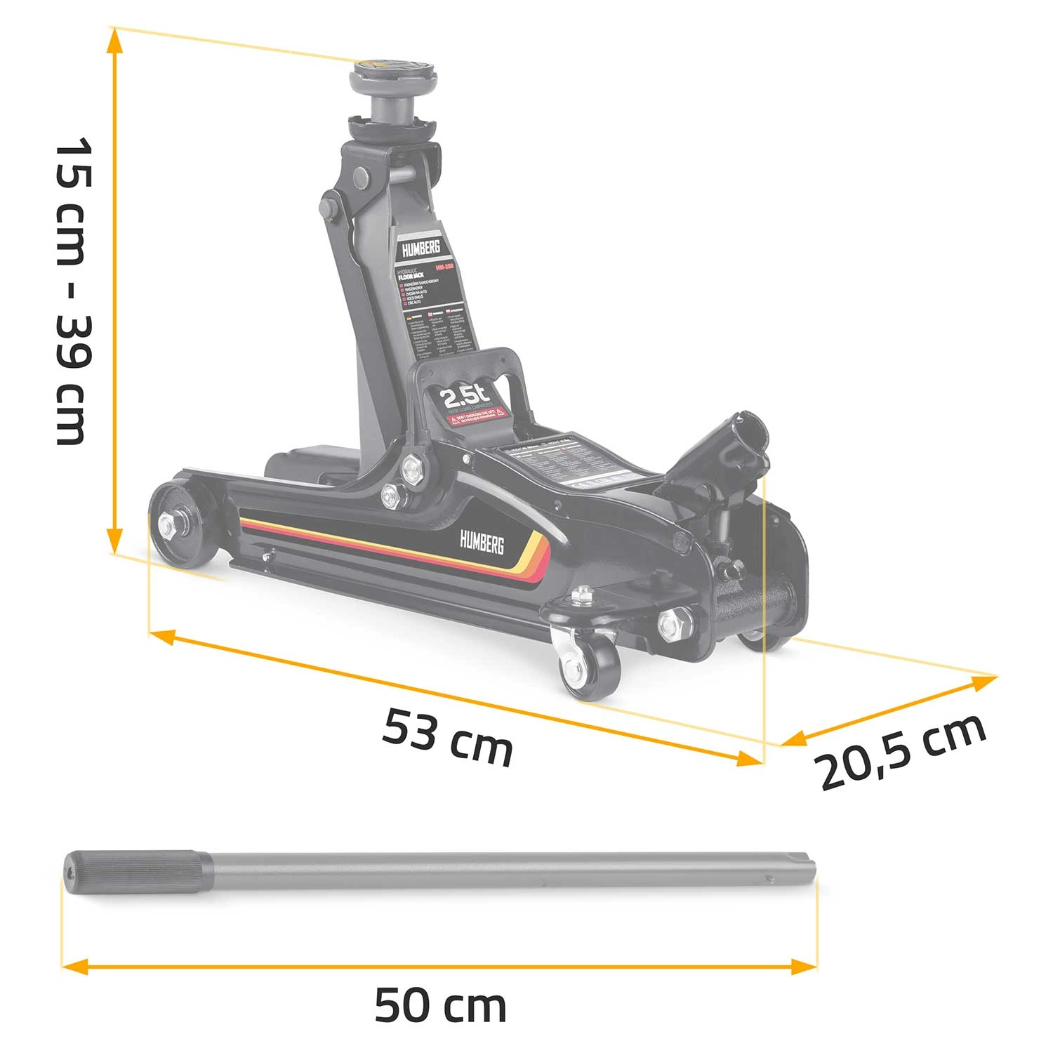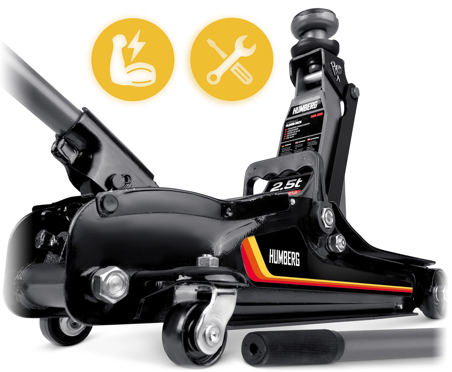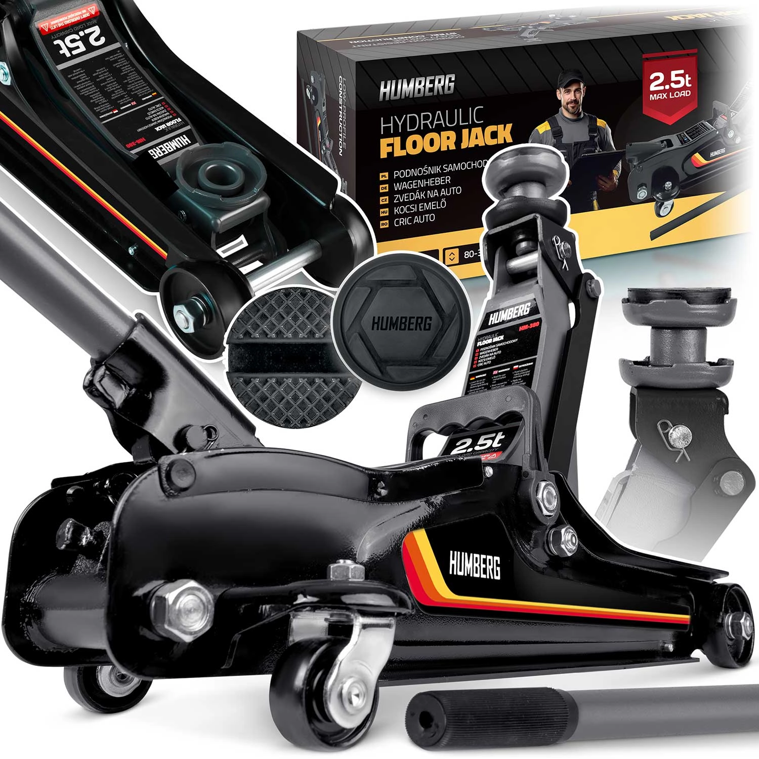 Nízkoprofilový zdvihák HUMBERG 2,5 t je ideálnou voľbou pre rýchle a bezpečné zdvíhanie osobných áut, multivanov i menších dodávok do hmotnosti 2 500 kg. Nízky profil so zdvihom 80–360 mm umožní prácu aj pri športovejšie posadených autách. Jednopiestová hydraulická jednotka zabezpečuje plynulé a efektívne zdvíhanie, zatiaľ čo pretlakový bezpečnostný ventil chráni pred preťažením.