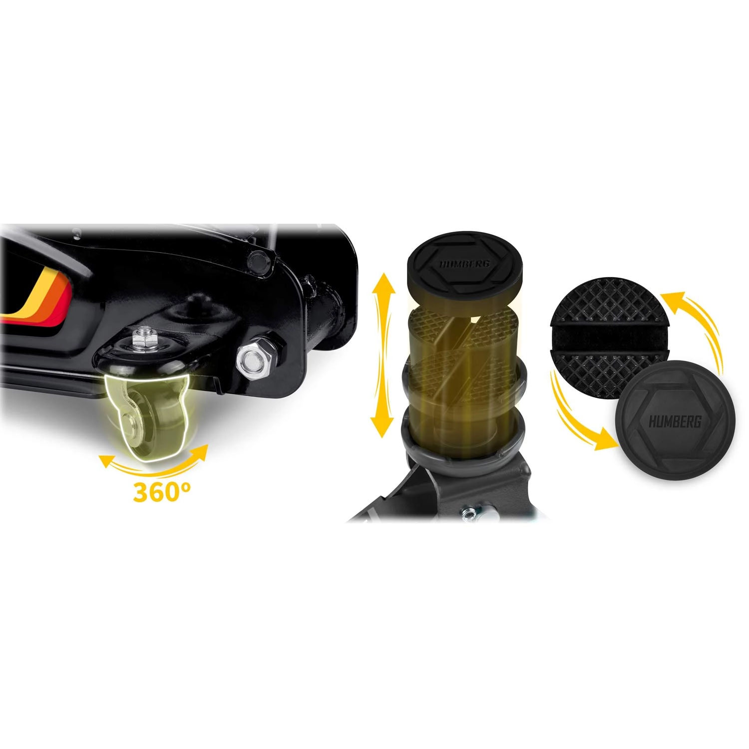 Robustná konštrukcia z ocele a hliníka kombinuje vysokú pevnosť s nižšou hmotnosťou pre jednoduchšiu manipuláciu. Široké predné kolesá a zadné 360° otočné kolieska s ložiskami zlepšujú stabilitu a ovládateľnosť v garáži aj na príjazdovej ceste. Praktická 50 cm pumpovacia páka s protišmykovým poťahom zabezpečuje pohodlné ovládanie.