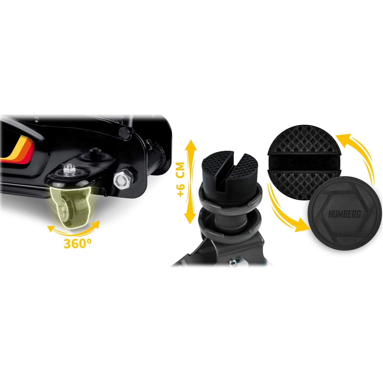 Vymeniteľné gumové pätky (15 a 35 mm) a oceľová zvýšená hlava chránia karosériu a zlepšujú dosadnutie na vyšších prahových bodoch.