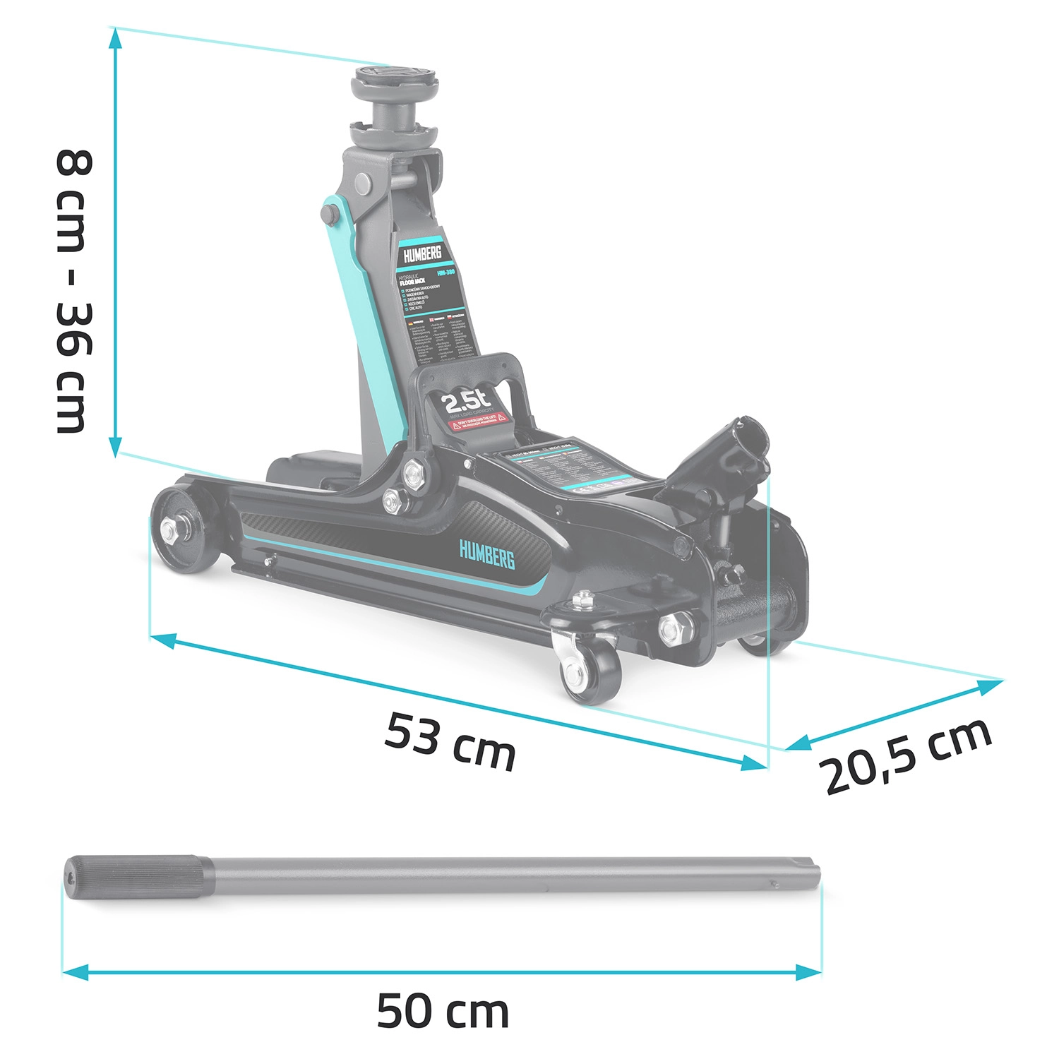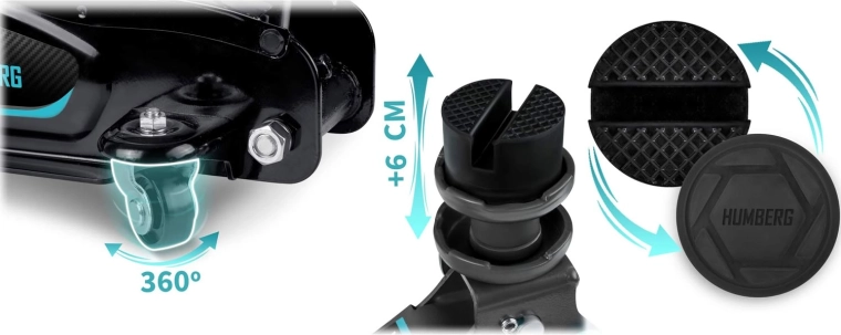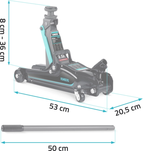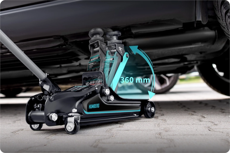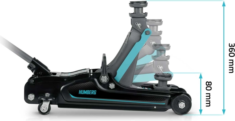 Výkonný nízkoprofilový hydraulický zdvihák HUMBERG s nosnosťou 2,5 t a rozsahom zdvihu 80–360 mm je ideálny pre osobné vozidlá aj malé dodávky. Ponúka robustnú oceľovo-hliníkovú konštrukciu, jednoduché manévrovanie vďaka kolieskam 360° a bezpečnostný prepúšťací ventil. Súčasťou balenia sú 2 vymeniteľné gumové podložky a oceľová zvýšená hlavica pre lepšie prispôsobenie rôznym prahom vozidiel.