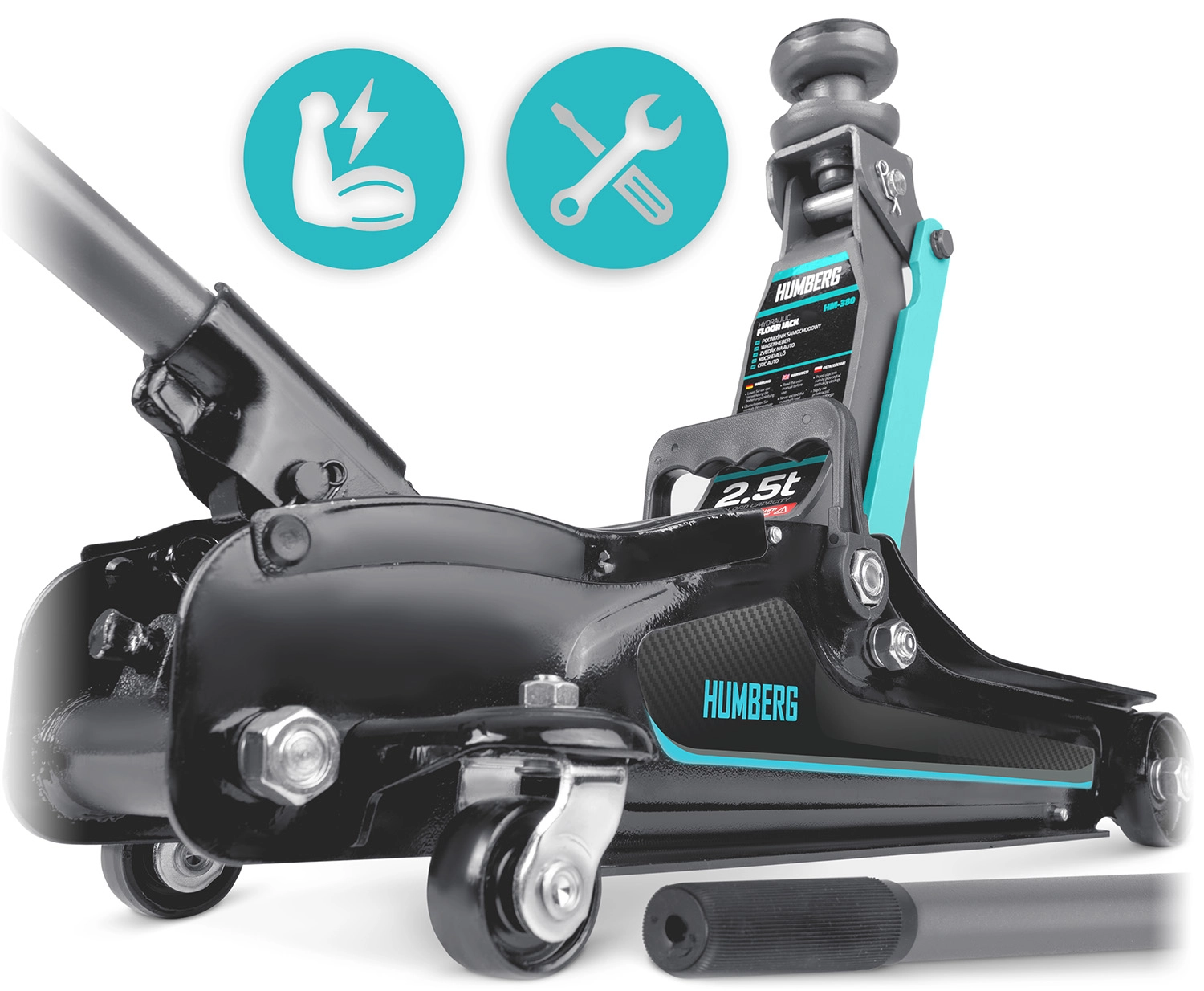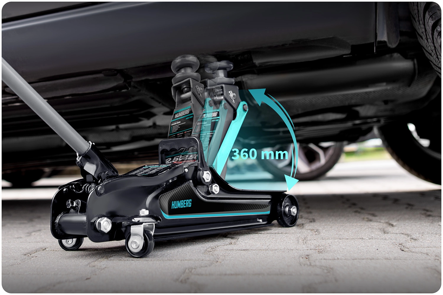 Masívna oceľová základňa v kombinácii s hliníkovými prvkami znižuje hmotnosť a zvyšuje odolnosť. Otočné zadné kolieska s ložiskami (360°) zabezpečujú plynulú manipuláciu pod vozidlom, bezpečnostný prepúšťací ventil chráni proti preťaženiu a dlhá páka s protišmykovým poťahom uľahčuje efektívne a presné zdvíhanie.