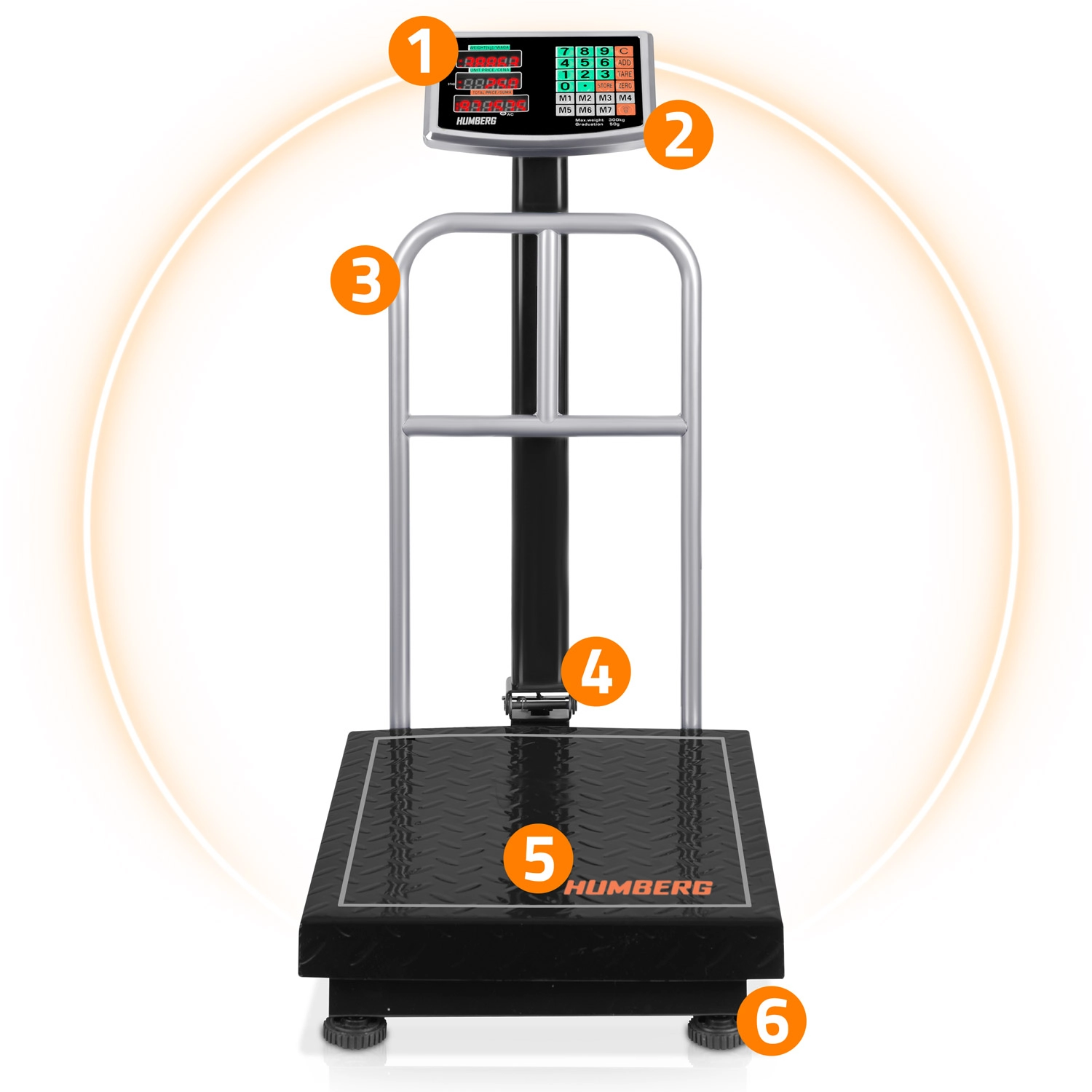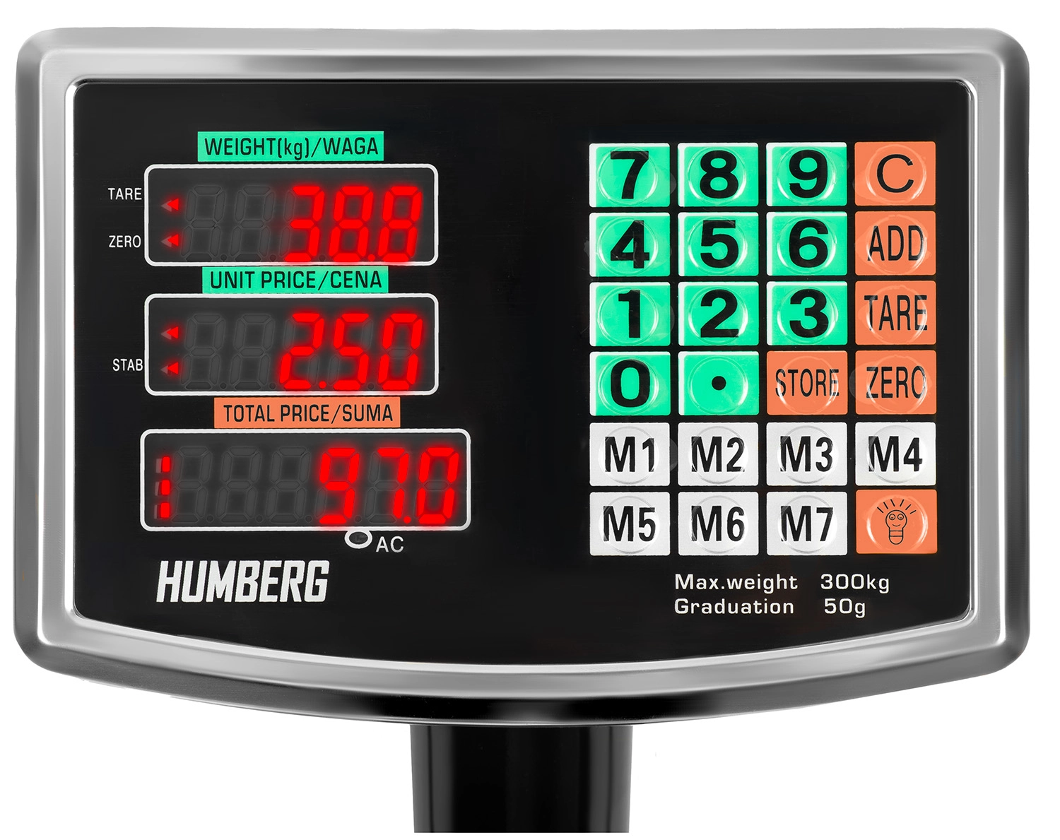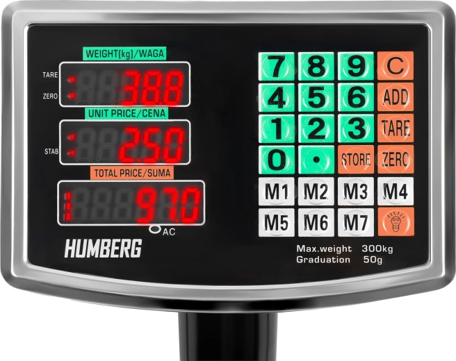 Trojitý podsvietený displej je perfektne čitateľný, funkčná klávesnica zahŕňa okrem iného pamäť až na 7 cien a režim počítania kusov (1–99). Vďaka upozorneniu na preťaženie, automatickému zapnutiu/vypnutiu a nastaviteľným nožičkám je obsluha rýchla a bezpečná. Napájanie zabezpečuje sieťový adaptér alebo akumulátor 6 V 4Ah pre mobilné použitie bez prístupu k zásuvke.