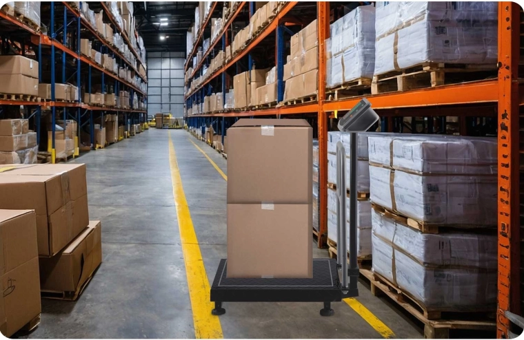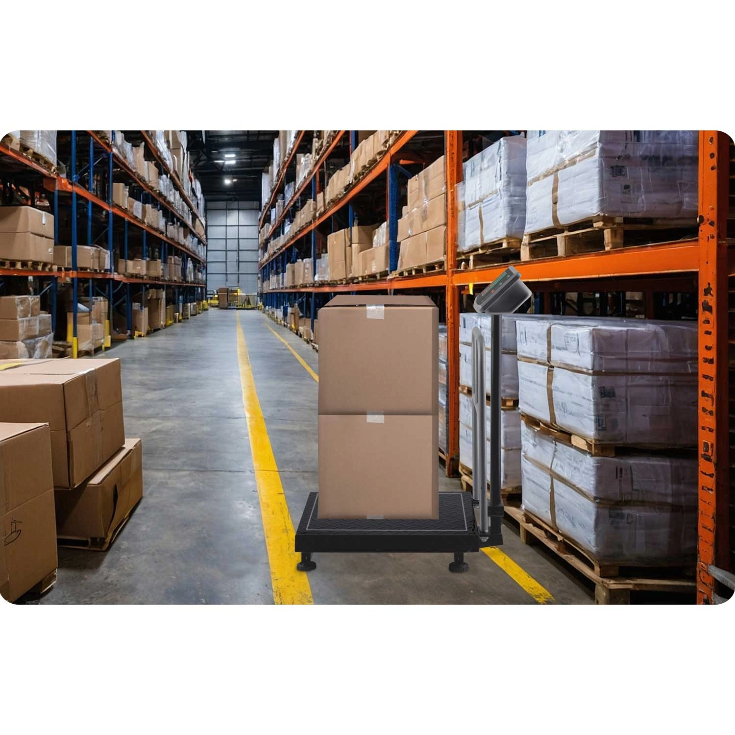 Praktické detaily ako madlo/opierka pre vyššie či nestabilné náklady, zvýraznený obrys pre rovnomerné rozloženie hmotnosti a skladací mechanizmus zefektívňujú prácu, skracujú čas manipulácie a minimalizujú chybovosť pri vážení.