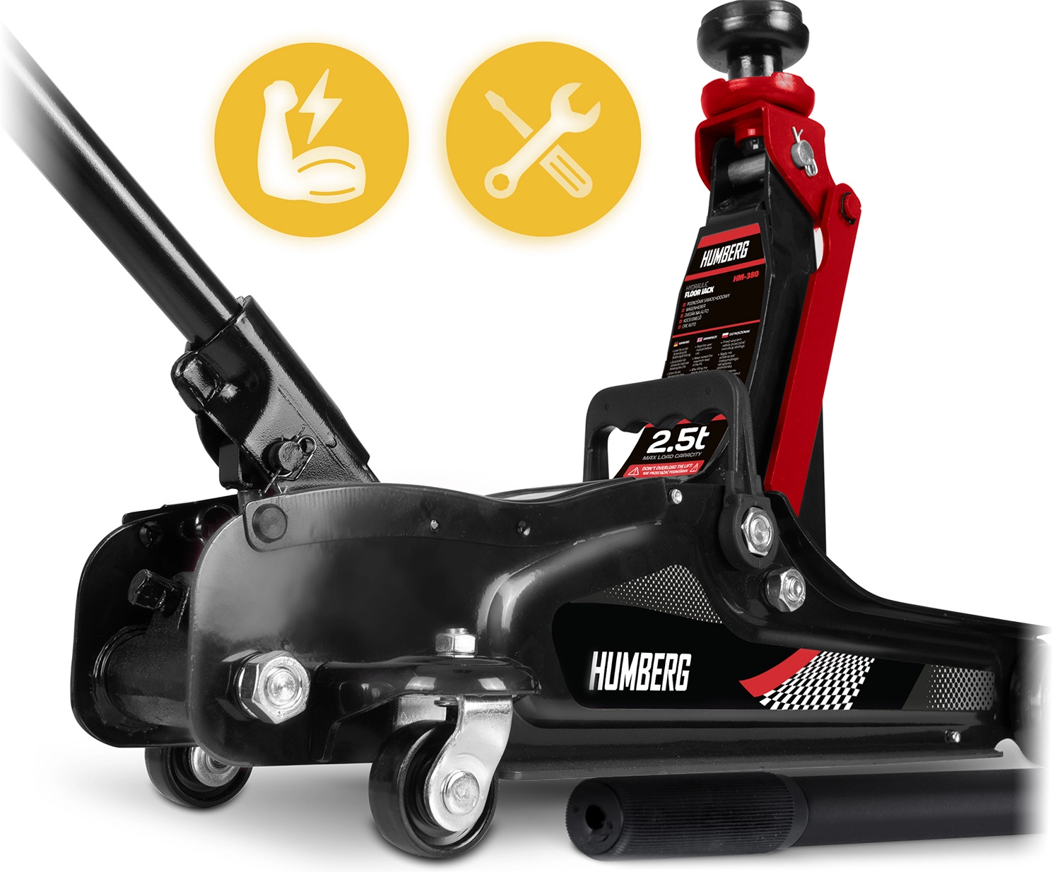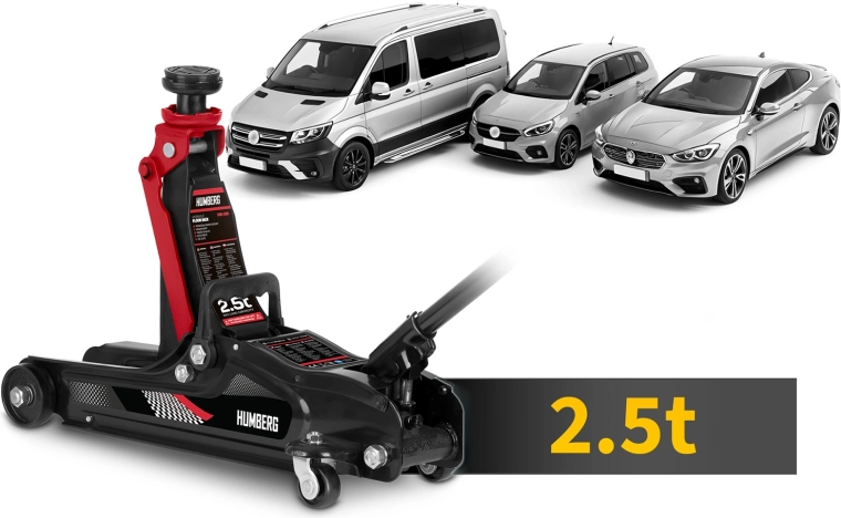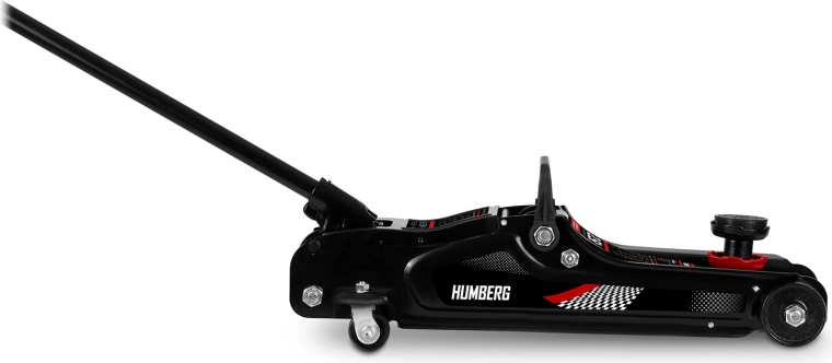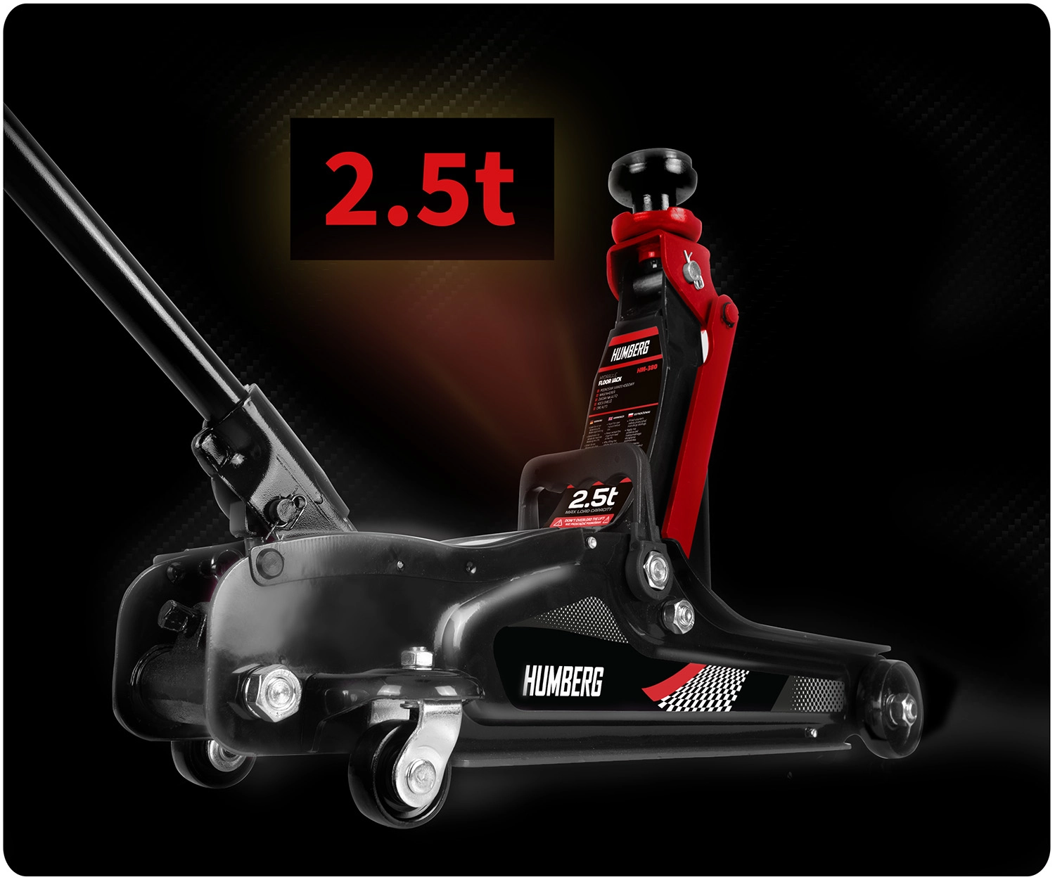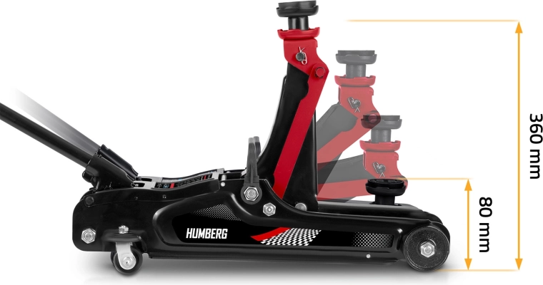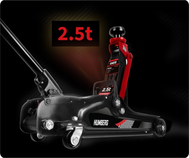Výkonný nízkoprofilový hydraulický zdvihák HUMBERG s nosnosťou 2,5 t spoľahlivo zdvihne osobné vozidlá aj malé dodávky. Vďaka rozsahu zdvihu 80–360 mm sa vojde aj pod nízke autá, má oceľovo‑hliníkovú konštrukciu, 360° otočné kolieska pre jednoduché manévrovanie a obsahuje vymeniteľné gumové nadstavce a prídavnú oceľovú hlavicu pre lepšie prispôsobenie rôznym prahom.