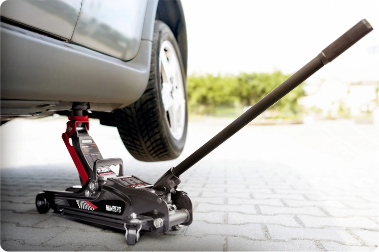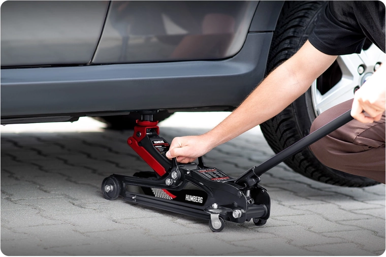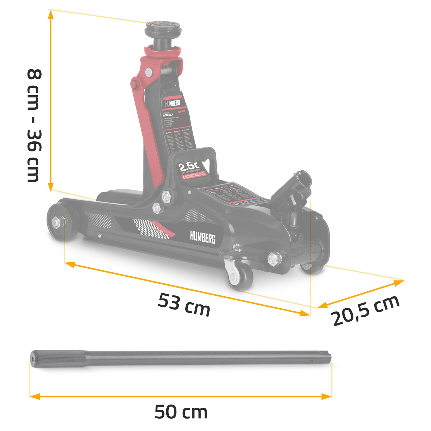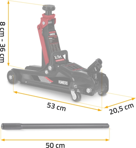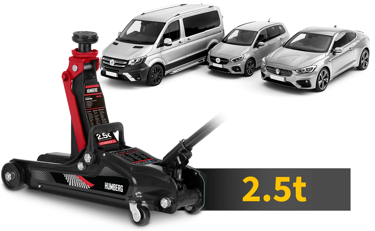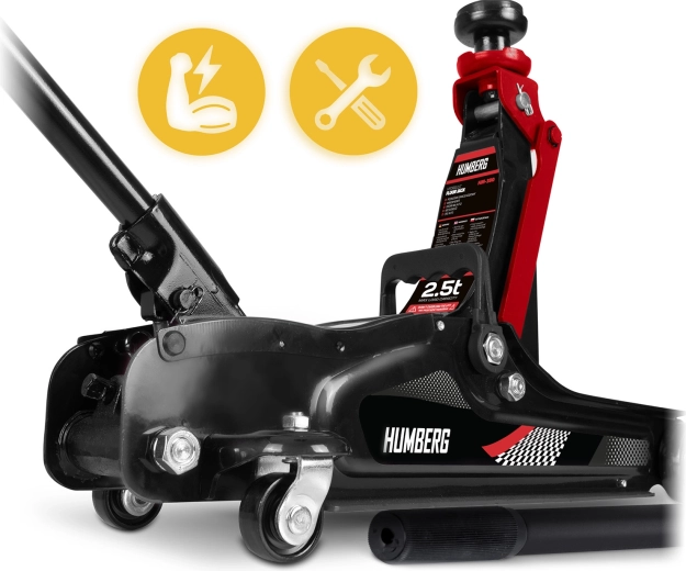 Výkonný nízkoprofilový hydraulický zdvihák HUMBERG s nosnosťou 2,5 t spoľahlivo zdvihne osobné vozidlá aj malé dodávky. Vďaka rozsahu zdvihu 80–360 mm sa vojde aj pod nízke autá, má oceľovo‑hliníkovú konštrukciu, 360° otočné kolieska pre jednoduché manévrovanie a obsahuje vymeniteľné gumové nadstavce a prídavnú oceľovú hlavicu pre lepšie prispôsobenie rôznym prahom.