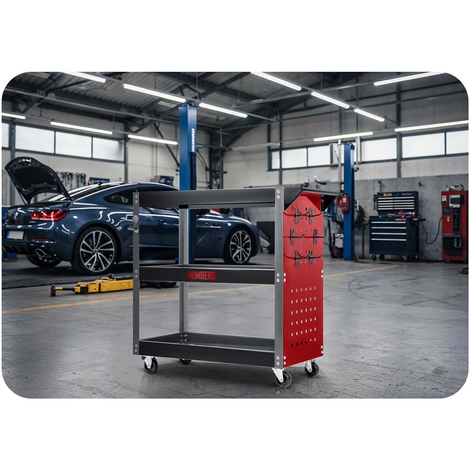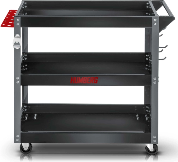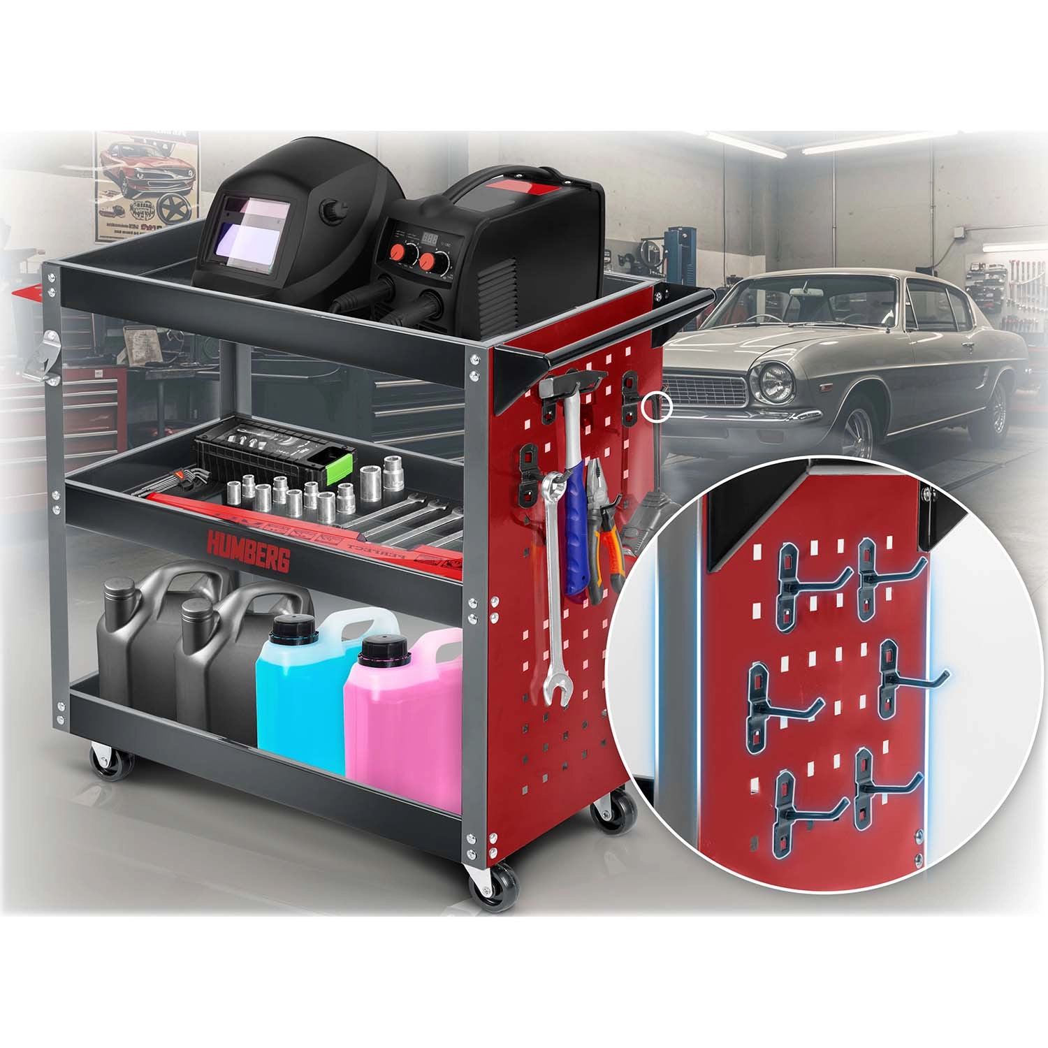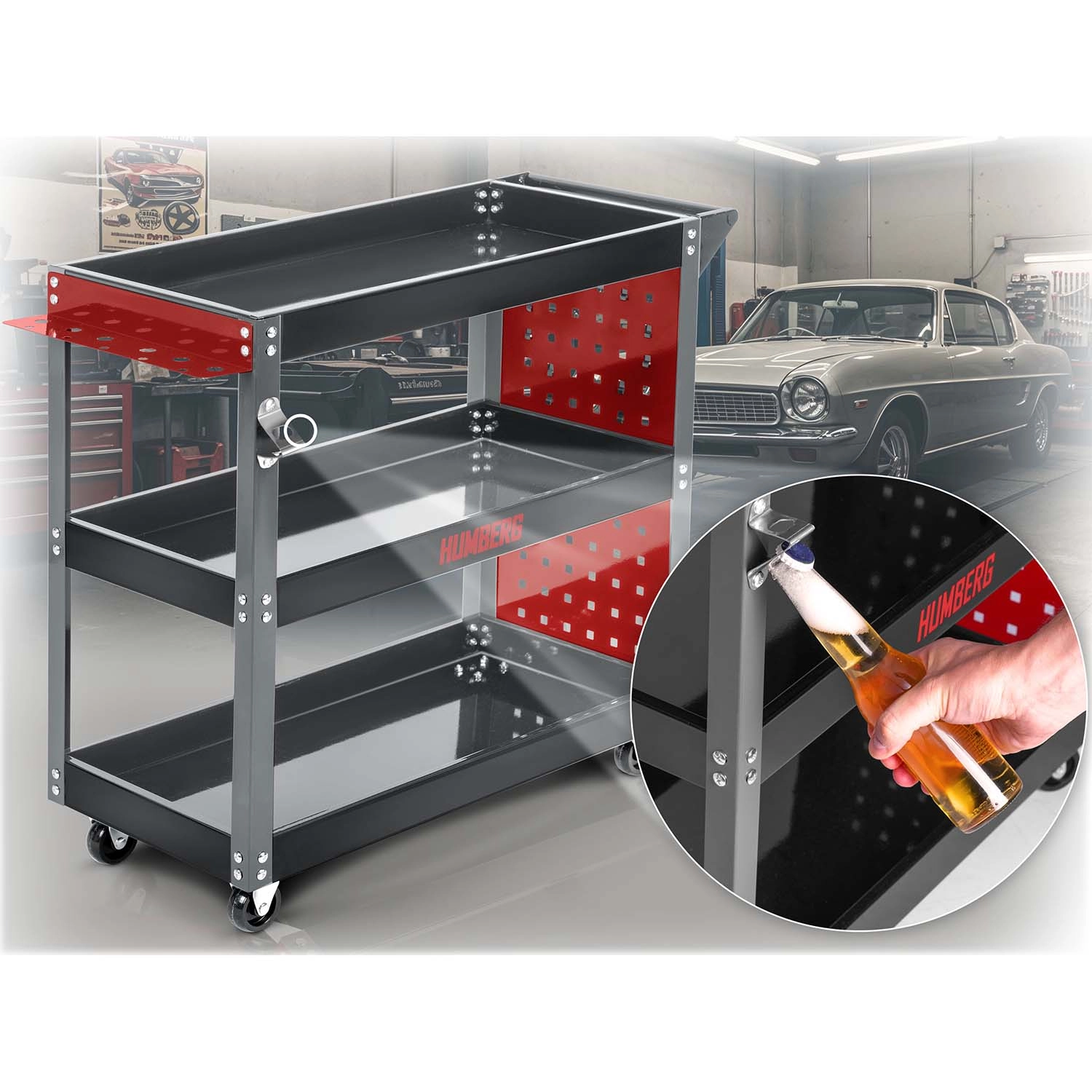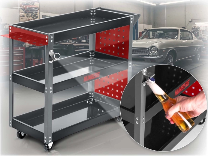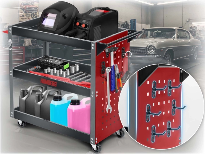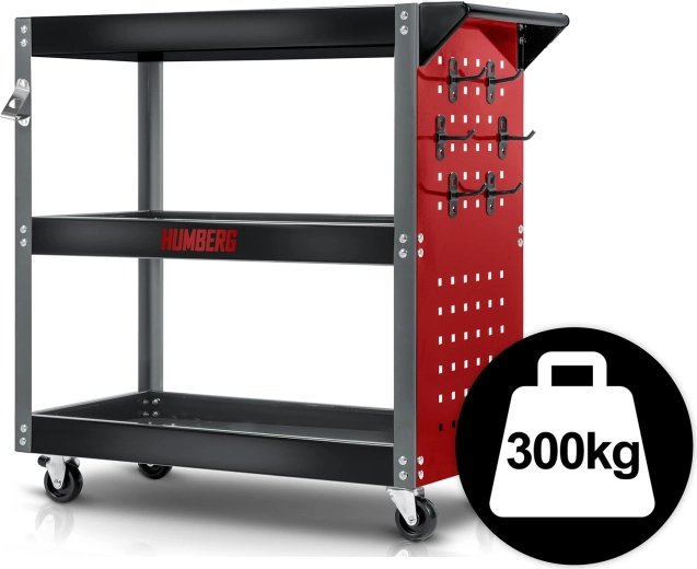 Vozík HUMBERG je navrhnutý pre náročné dielenské prostredie. Kombinuje nehrdzavejúcu oceľ a hliník pre vysokú odolnosť a dlhú životnosť. Tri hlboké police poskytujú dostatok priestoru pre náradie, diely aj príslušenstvo, zatiaľ čo perforované bočné panely s háčikmi udržia často používané nástroje vždy poruke.