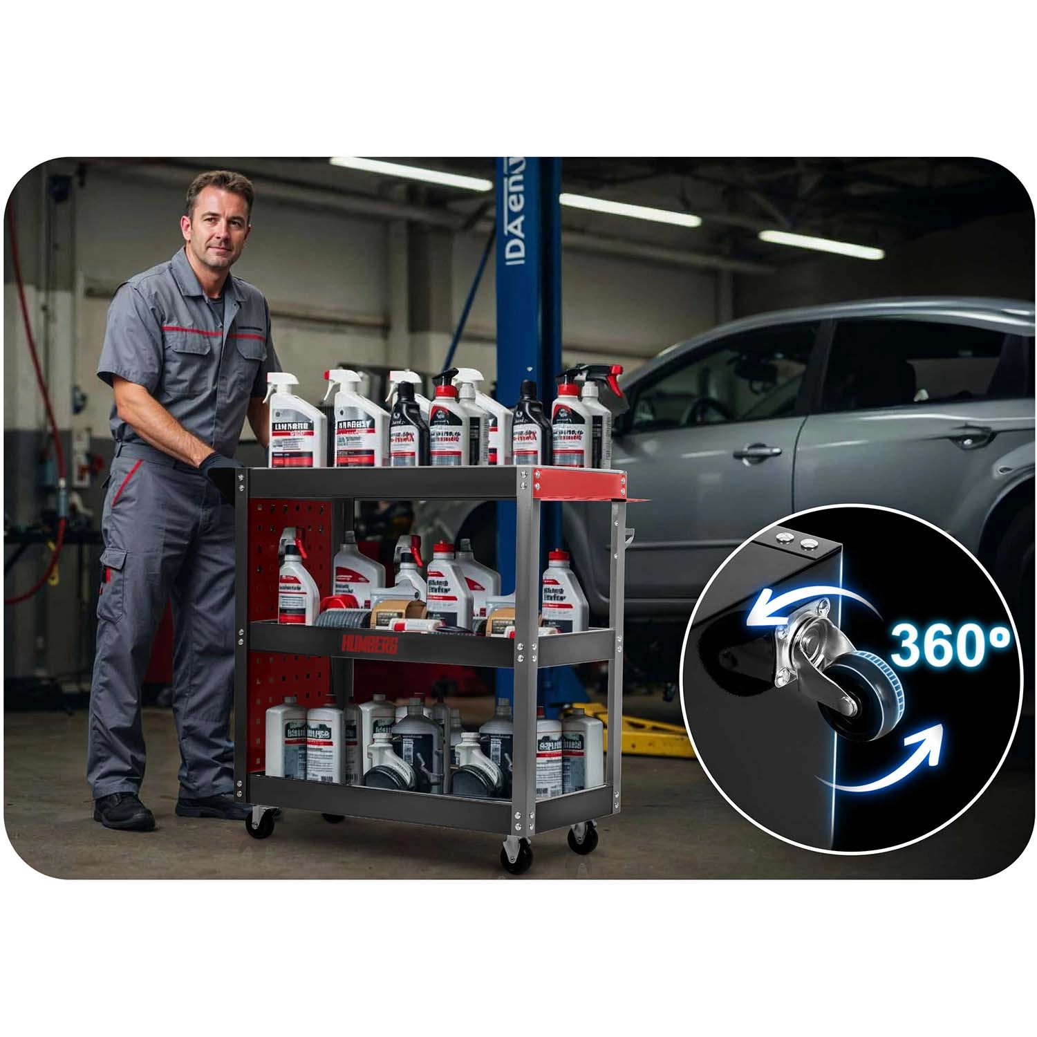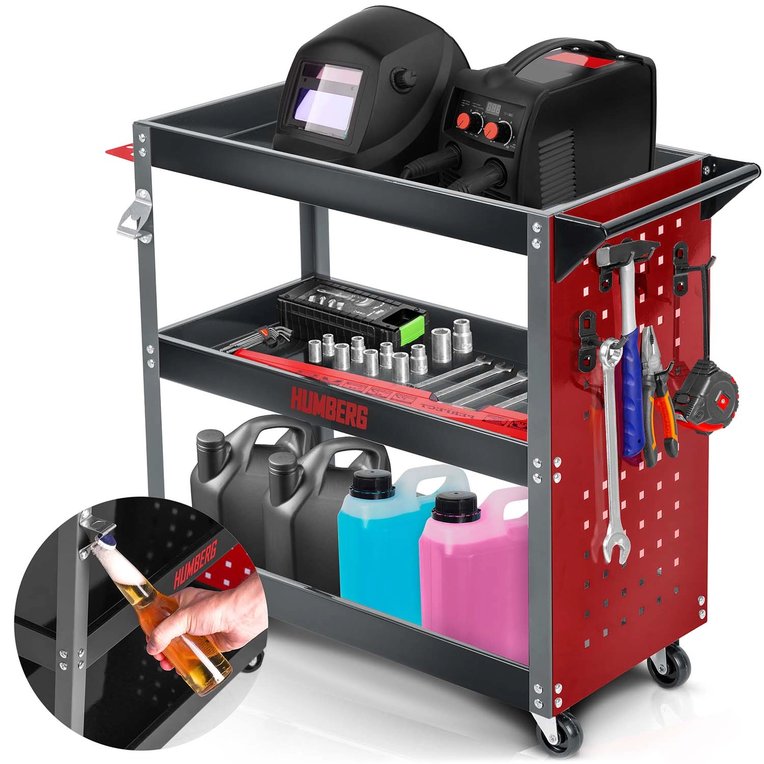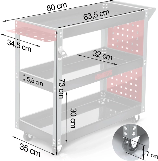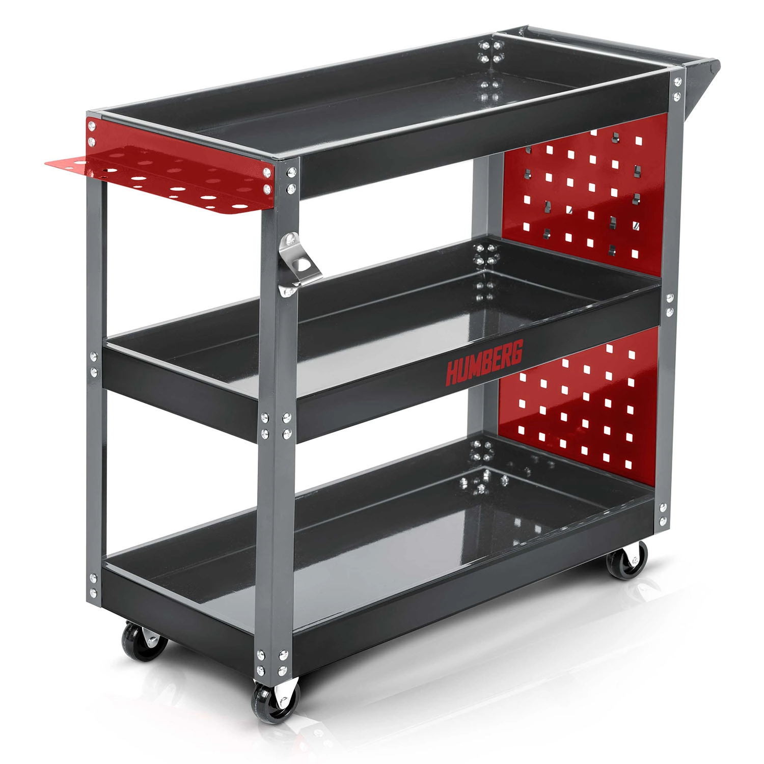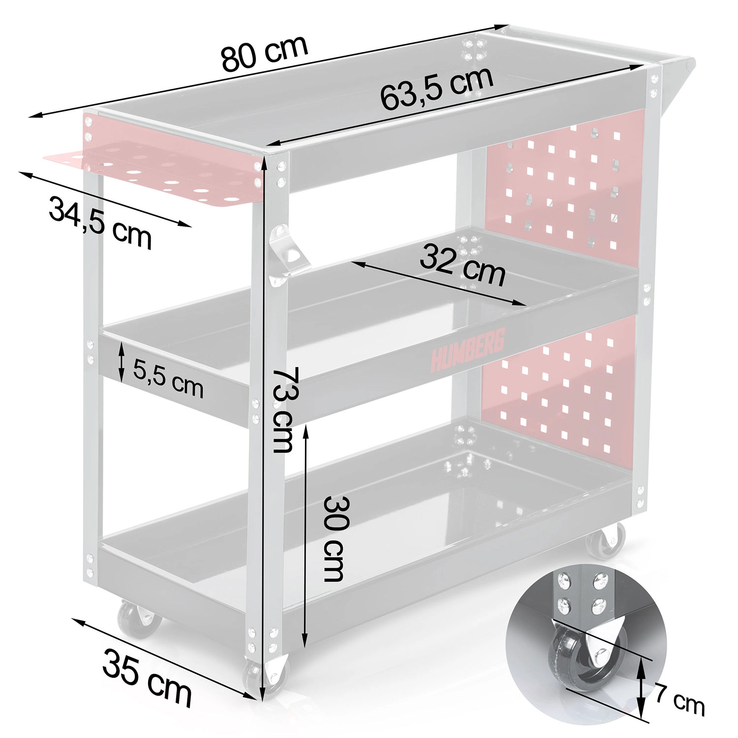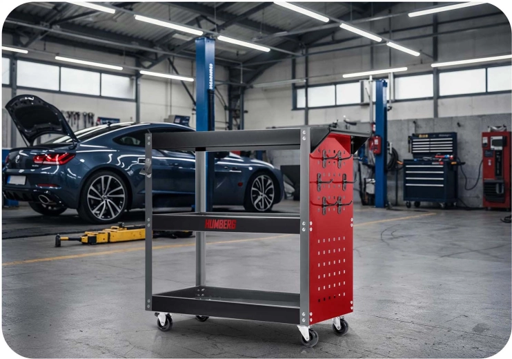 Vozík HUMBERG je navrhnutý pre náročné dielenské prostredie. Kombinuje nehrdzavejúcu oceľ a hliník pre vysokú odolnosť a dlhú životnosť. Tri hlboké police poskytujú dostatok priestoru pre náradie, diely aj príslušenstvo, zatiaľ čo perforované bočné panely s háčikmi udržia často používané nástroje vždy poruke.