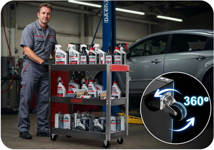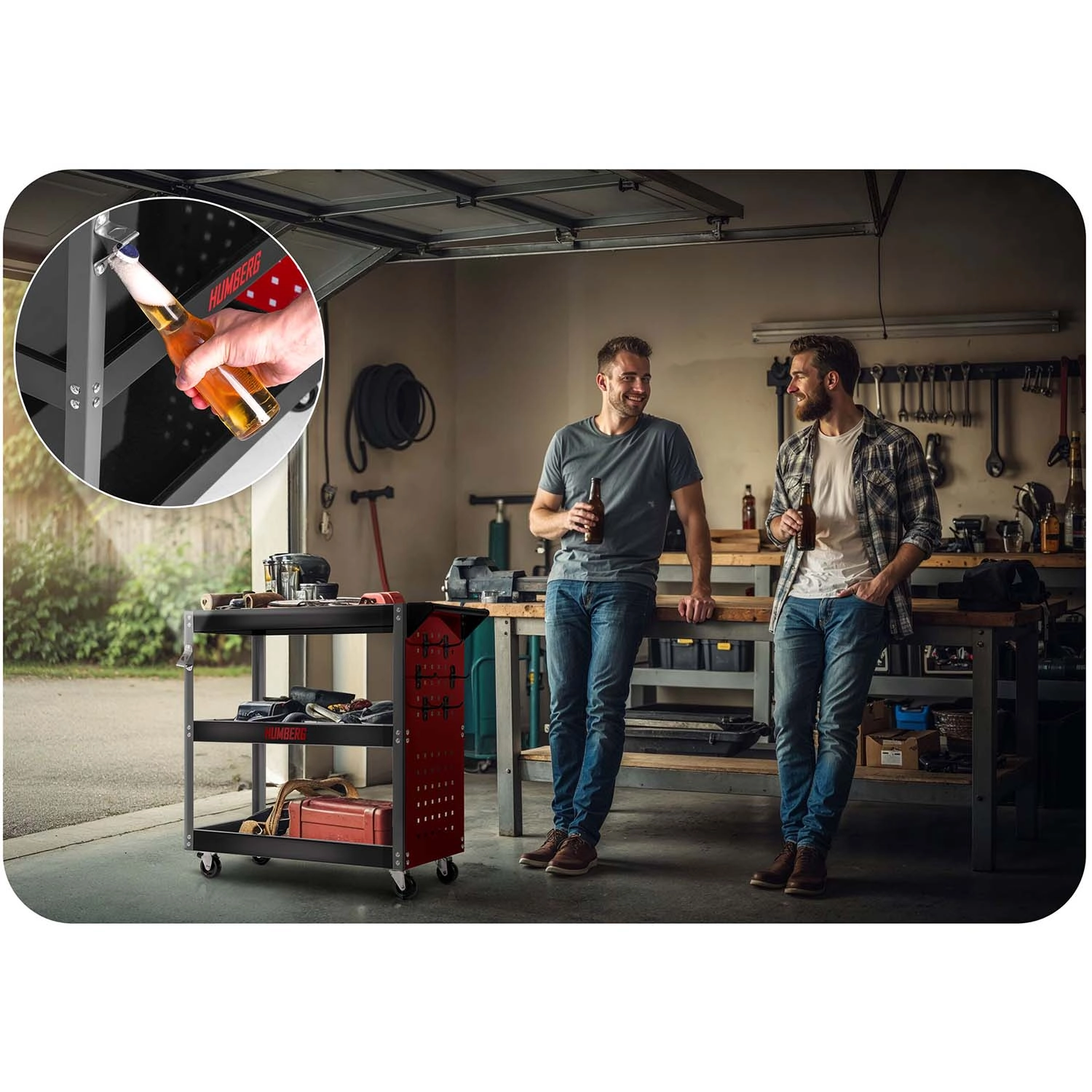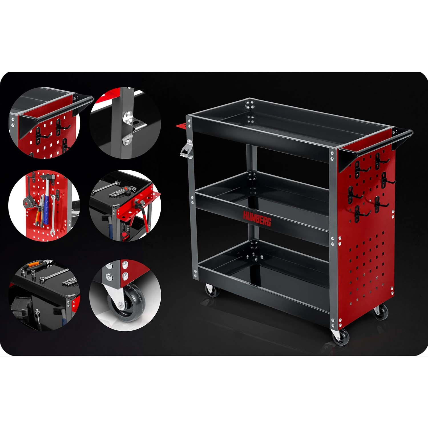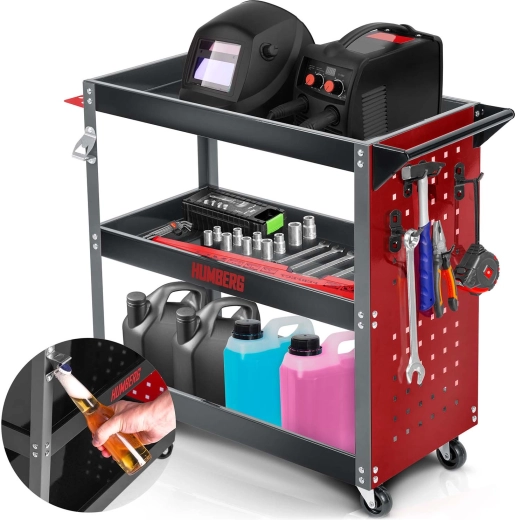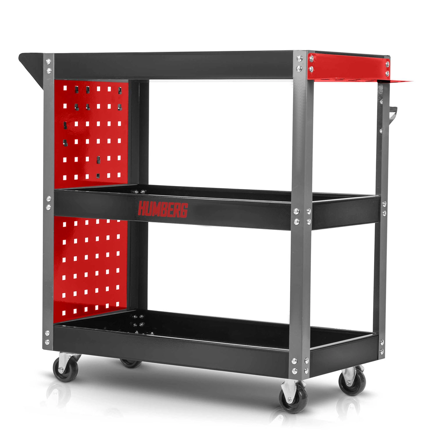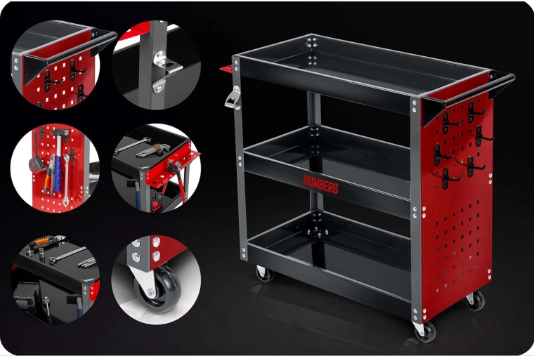 Vozík HUMBERG je navrhnutý pre náročné dielenské prostredie. Kombinuje nehrdzavejúcu oceľ a hliník pre vysokú odolnosť a dlhú životnosť. Tri hlboké police poskytujú dostatok priestoru pre náradie, diely aj príslušenstvo, zatiaľ čo perforované bočné panely s háčikmi udržia často používané nástroje vždy poruke.