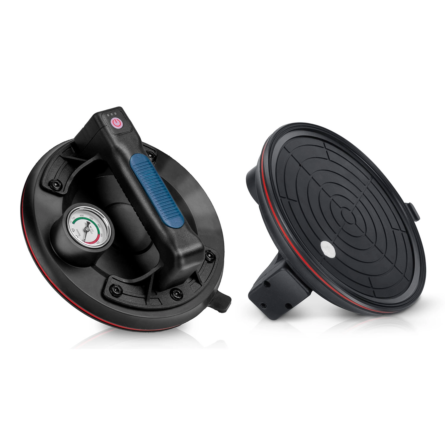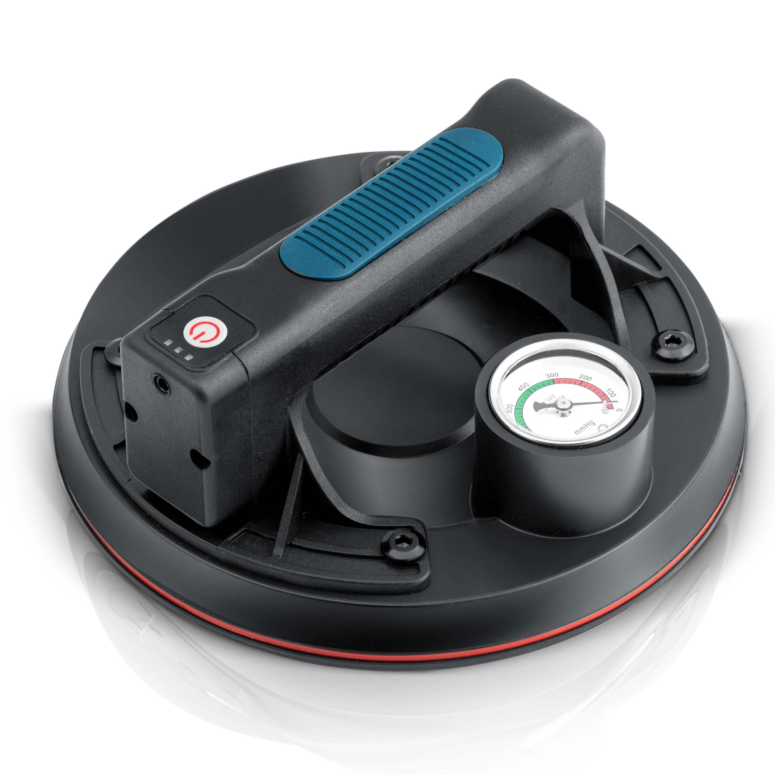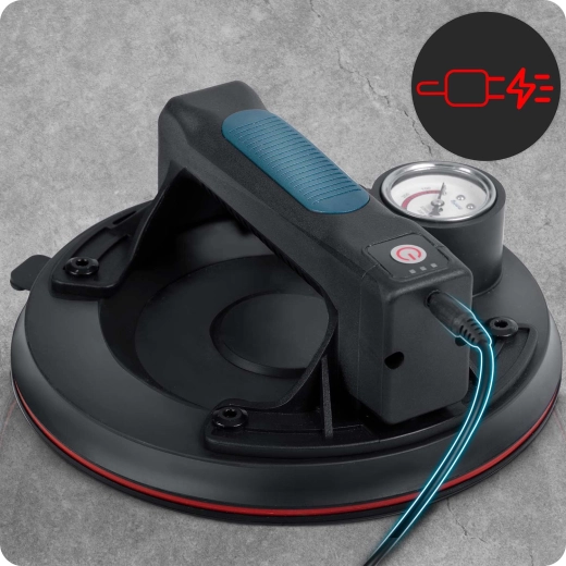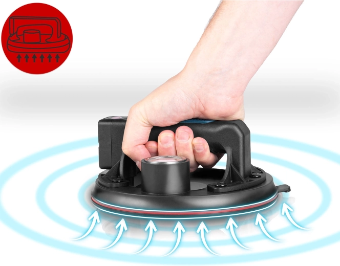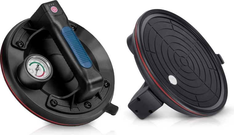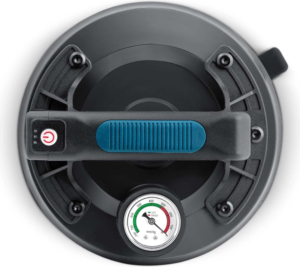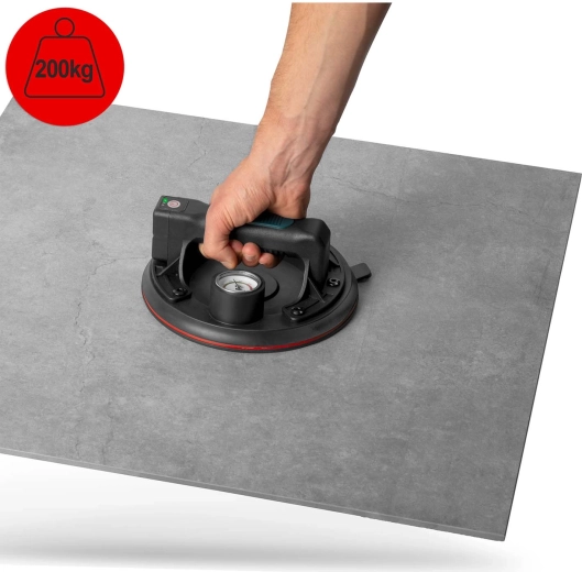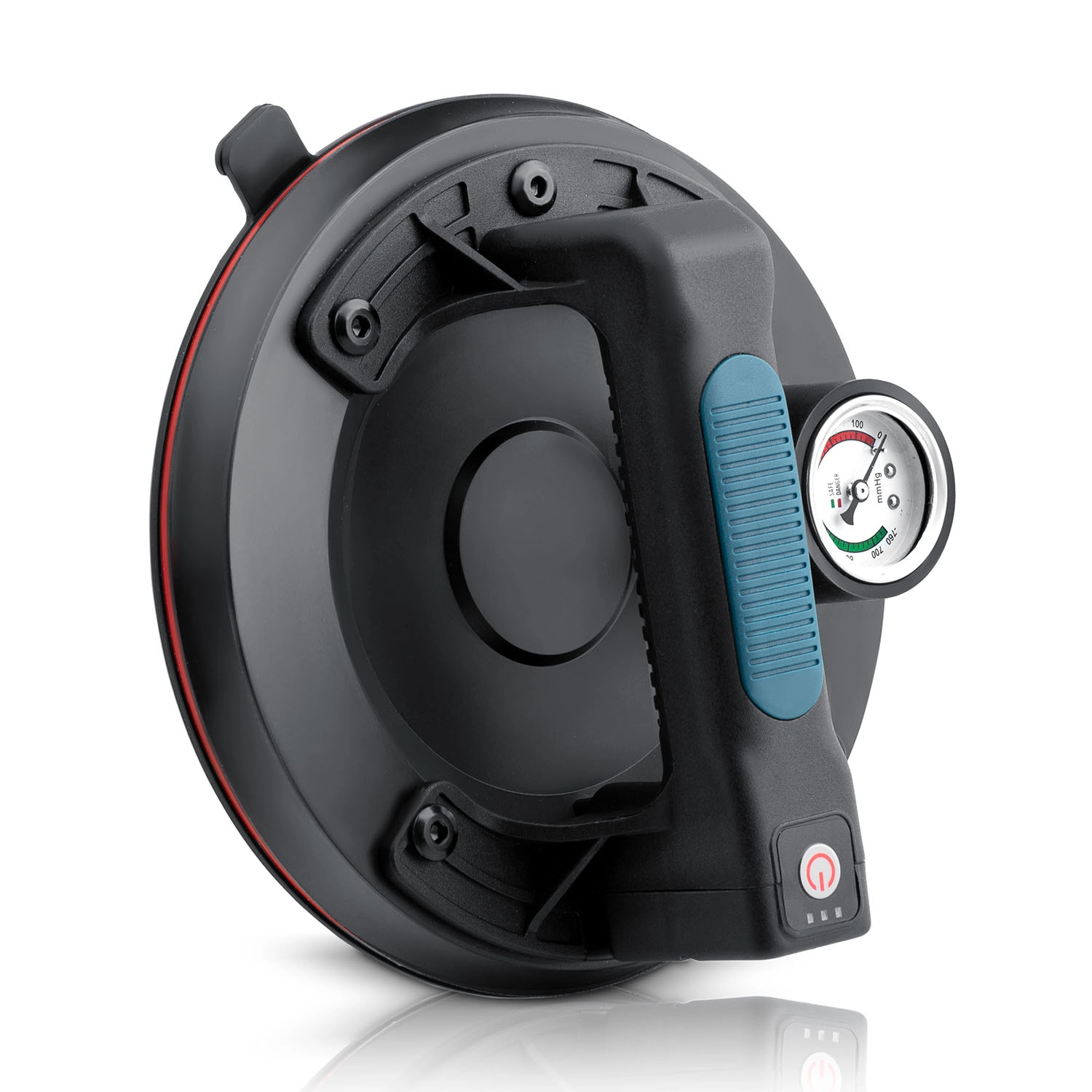 Táto kompaktná elektrická prísavka je navrhnutá pre rýchlu a bezpečnú manipuláciu s ťažkými panelmi, sklom, dlaždicami či lešteným kameňom. Trojitá gumená tesniaca manžeta zabezpečuje výbornú priľnavosť, tesnosť a tlmenie vibrácií, zatiaľ čo manometer s farebnou stupnicou poskytuje neustálu kontrolu nad úrovňou podtlaku (optimálne 300–760 mmHg). Ergonomická rukoväť s tvarovaným úchopom zvyšuje pohodlie aj pri dlhšej práci.