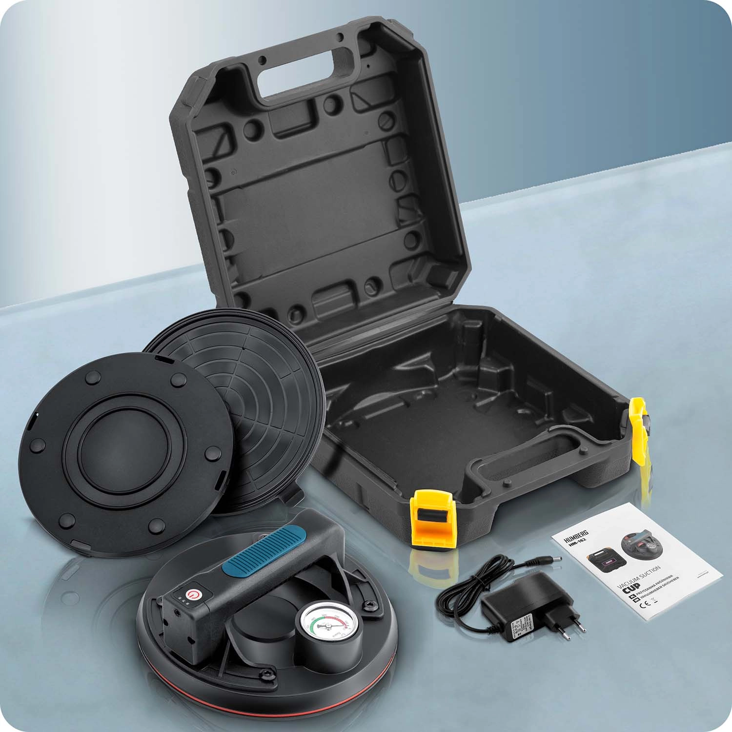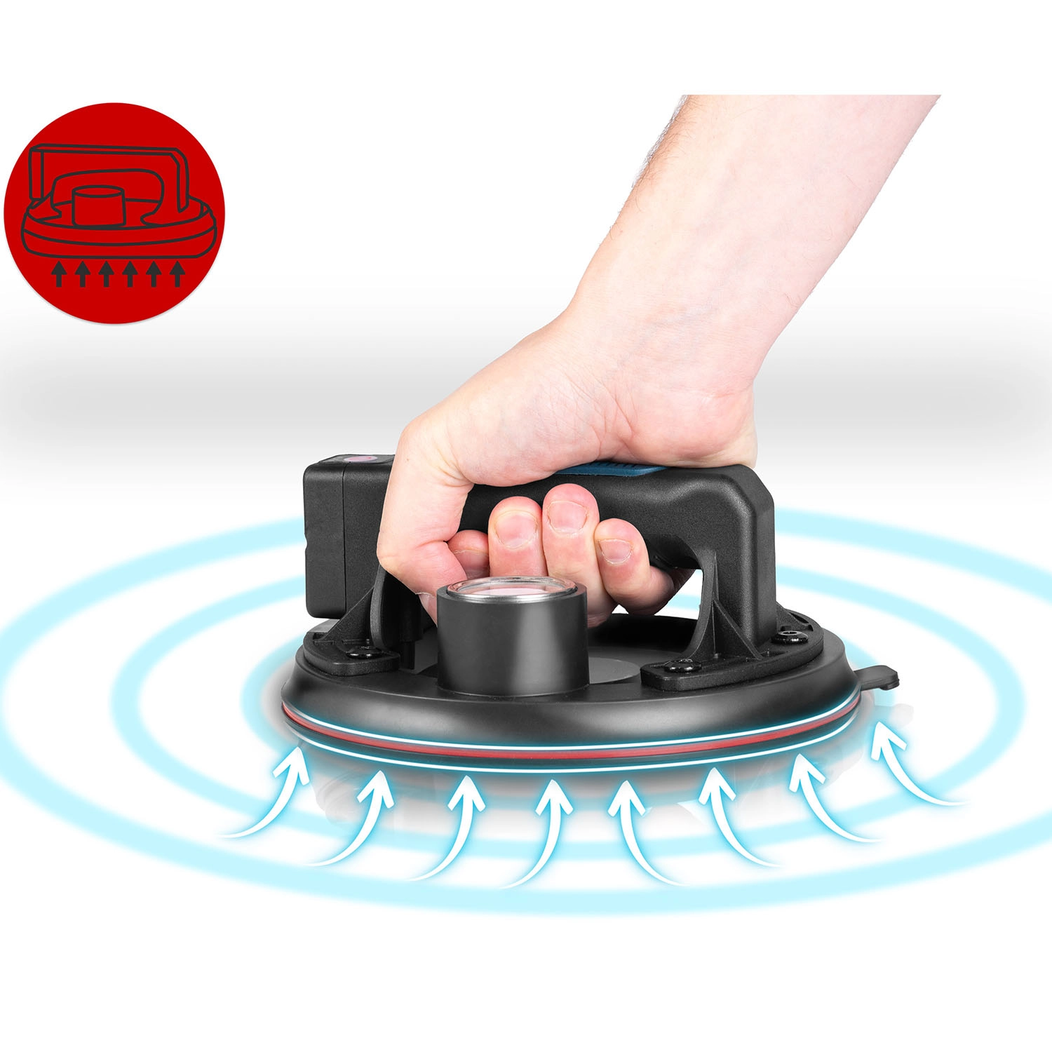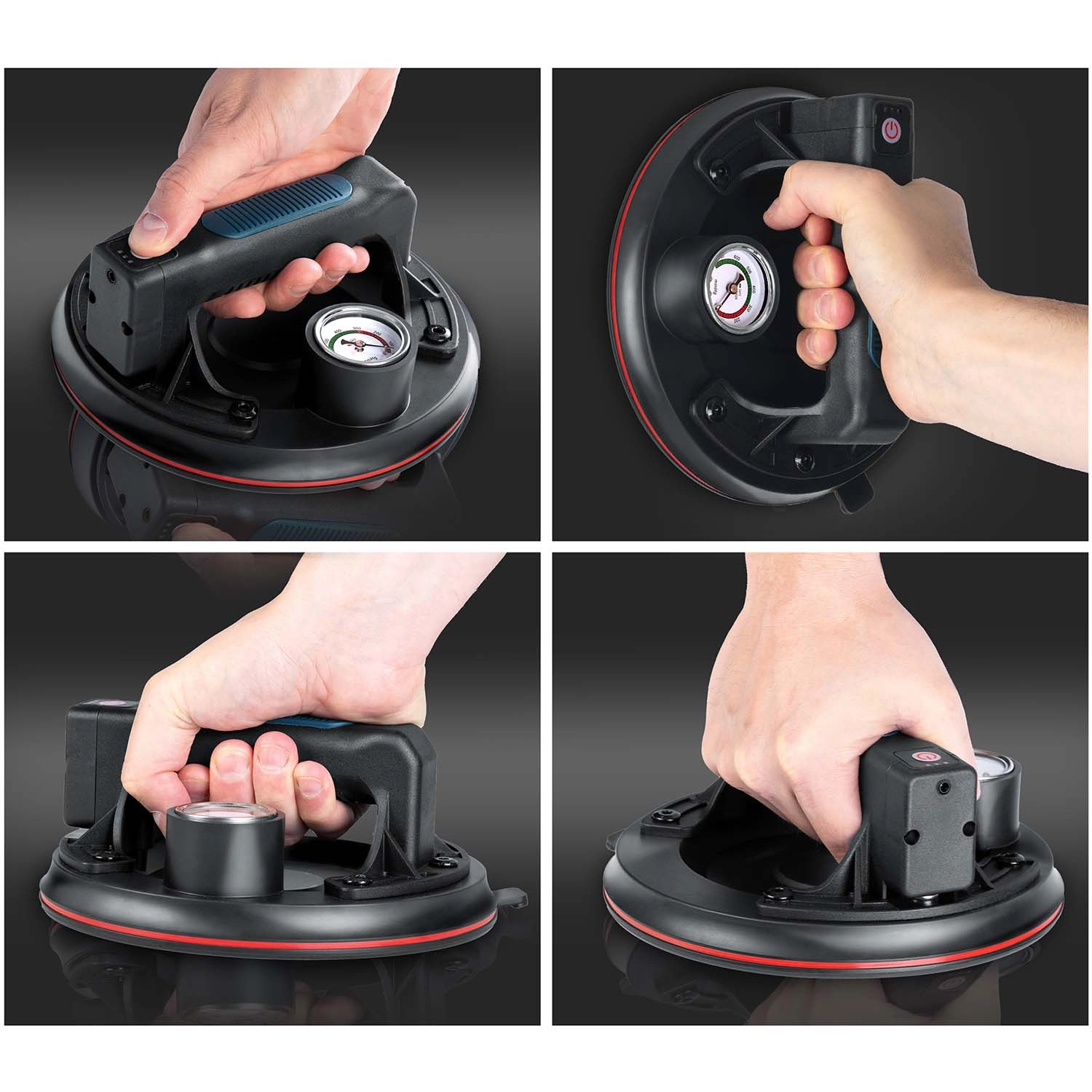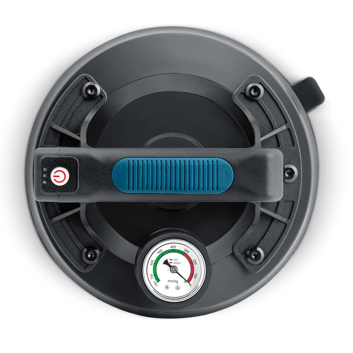 Táto kompaktná elektrická prísavka je navrhnutá pre rýchlu a bezpečnú manipuláciu s ťažkými panelmi, sklom, dlaždicami či lešteným kameňom. Trojitá gumená tesniaca manžeta zabezpečuje výbornú priľnavosť, tesnosť a tlmenie vibrácií, zatiaľ čo manometer s farebnou stupnicou poskytuje neustálu kontrolu nad úrovňou podtlaku (optimálne 300–760 mmHg). Ergonomická rukoväť s tvarovaným úchopom zvyšuje pohodlie aj pri dlhšej práci.