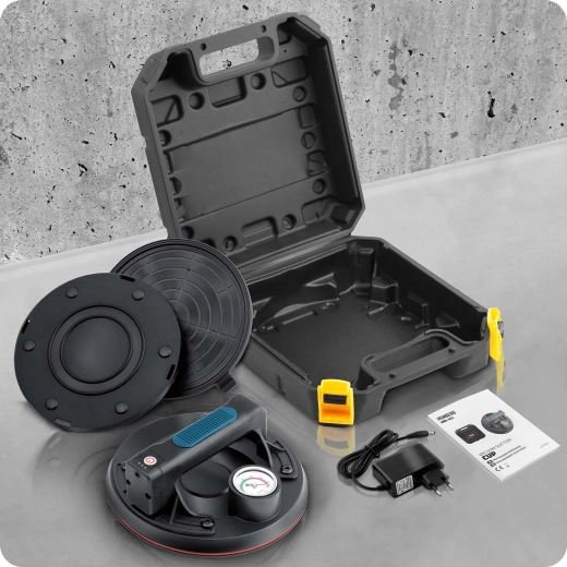 Vstavaná Li-ion batéria 2400 mAh umožňuje až 8 h nepretržitej prevádzky, pričom plné nabitie trvá len 2 hodiny. Prísavka je dodávaná v praktickom kufríku so všetkým potrebným príslušenstvom pre profesionálne použitie v montáži aj pri preprave materiálu.