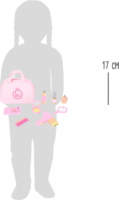 Zažite kúzlo hrania rolí s ružovou kozmetickou taštičkou plnou pôvabných drevených doplnkov. Tento set je perfektný pre malé parádnice.