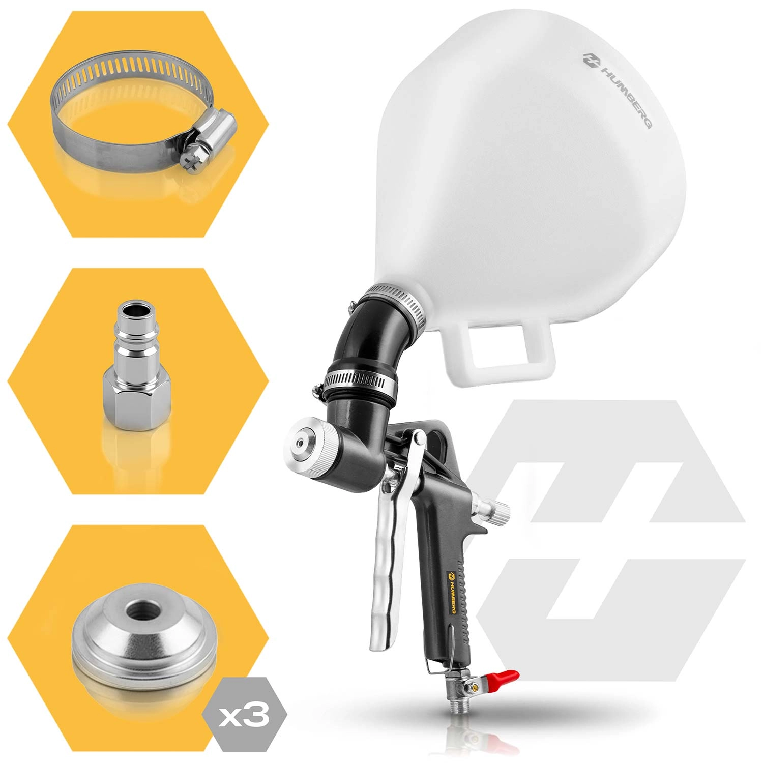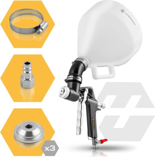 Výkonná pneumatická striekacia pištoľ HUMBERG s nádržou 6 l určená na rýchlu a rovnomernú aplikáciu omietok a dekoratívnych štruktúr. Súčasťou je komplet 3 trysiek 4/6/8 mm pre rôzne hustoty materiálov, rýchlospojka 1/4" a upevňovací krúžok pre bezpečné používanie. Ušetríte čas aj náklady a dosiahnete výsledky ako profesionál.