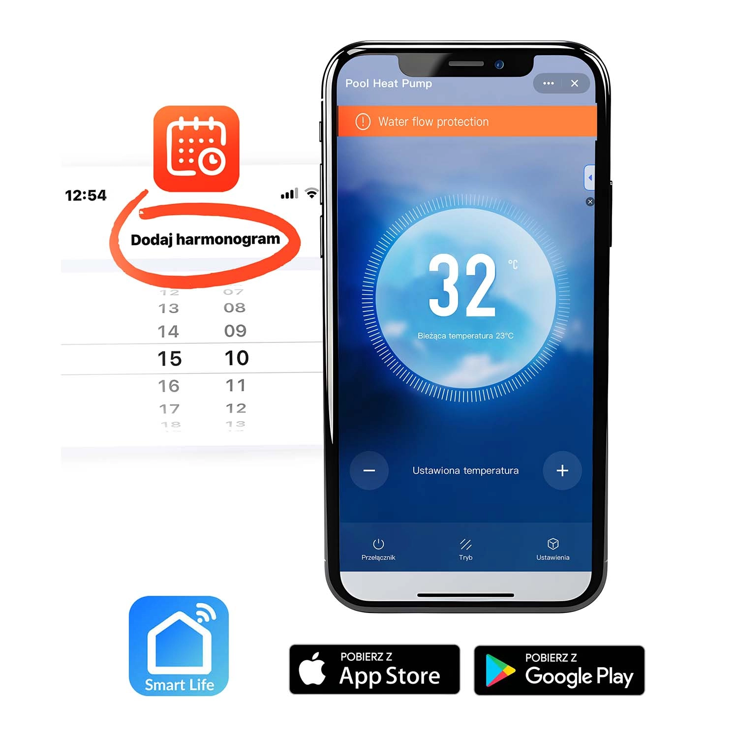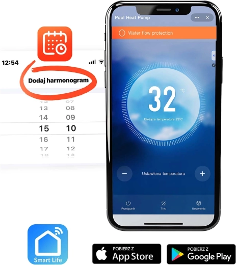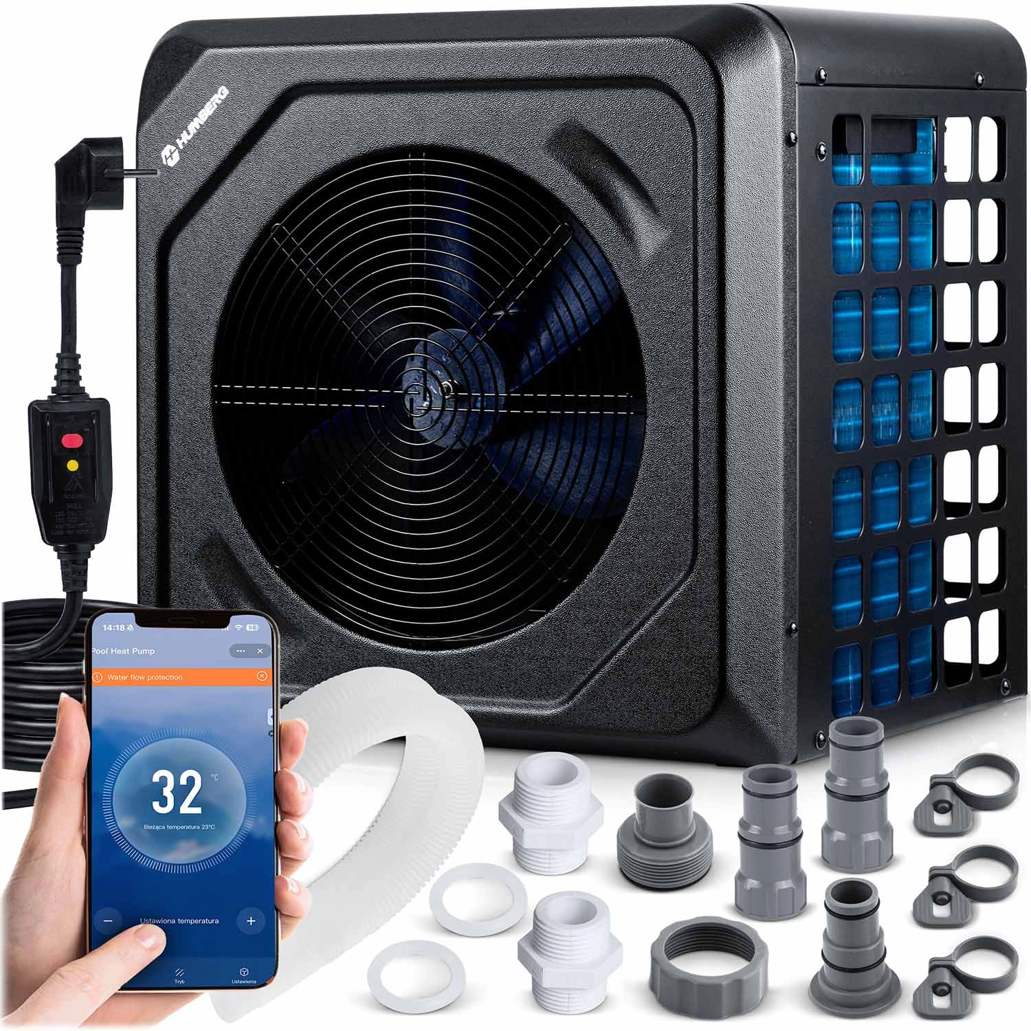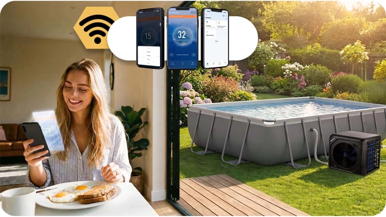 Súčasťou balenia sú univerzálne závitové koncovky, tesnenia, spony a hadice na rýchle pripojenie k bazénovej inštalácii. Ovládanie je maximálne pohodlné – cez Bluetooth/Wi‑Fi v mobilnej aplikácii ľahko nastavíte cieľovú teplotu, časovač aj harmonogram. Prehľadný LCD panel na jednotke umožňuje rýchle lokálne nastavenie.