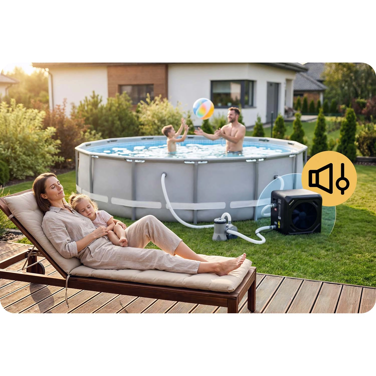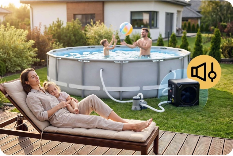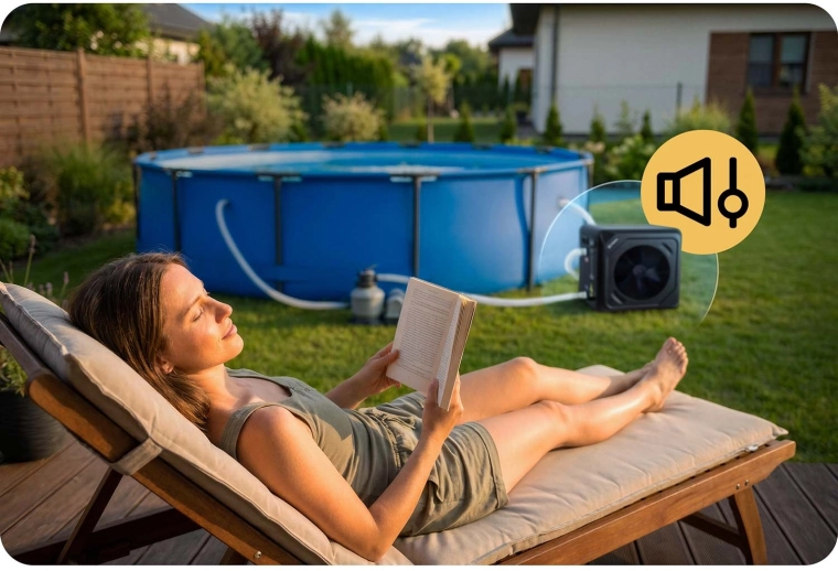 Vysoká účinnosť COP 5,17 s príkonom cca 900 W minimalizuje náklady. Hlučnosť iba 48 dB zaisťuje pokojný relax pri bazéne bez rušivého hluku.